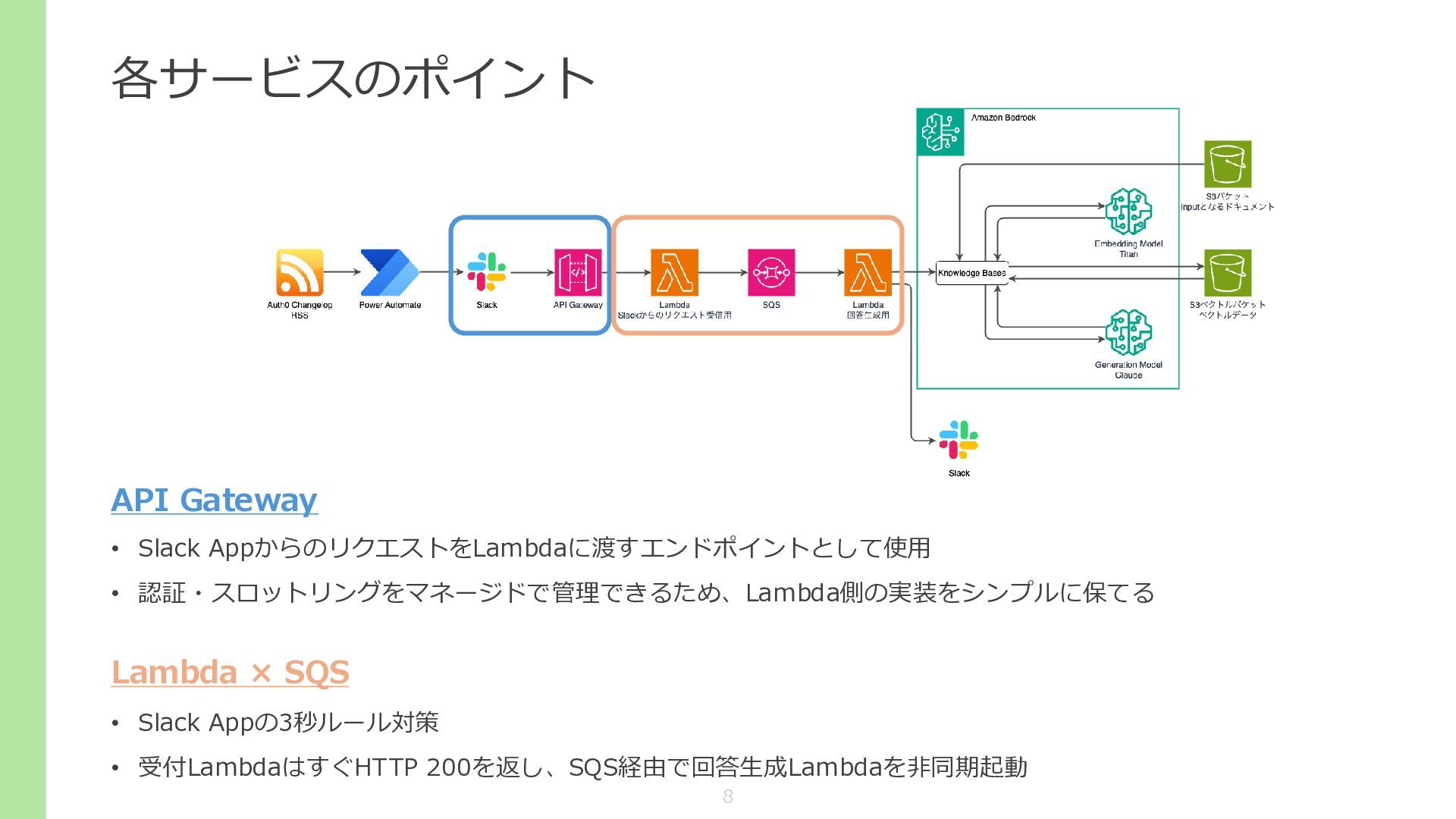 各サービスのポイント API Gateway • Slack AppからのリクエストをLambdaに渡すエンドポイントとして使用 • 認証・スロットリングをマネージドで管理できるため、Lambda側の実装をシンプルに保てる Lambda ×