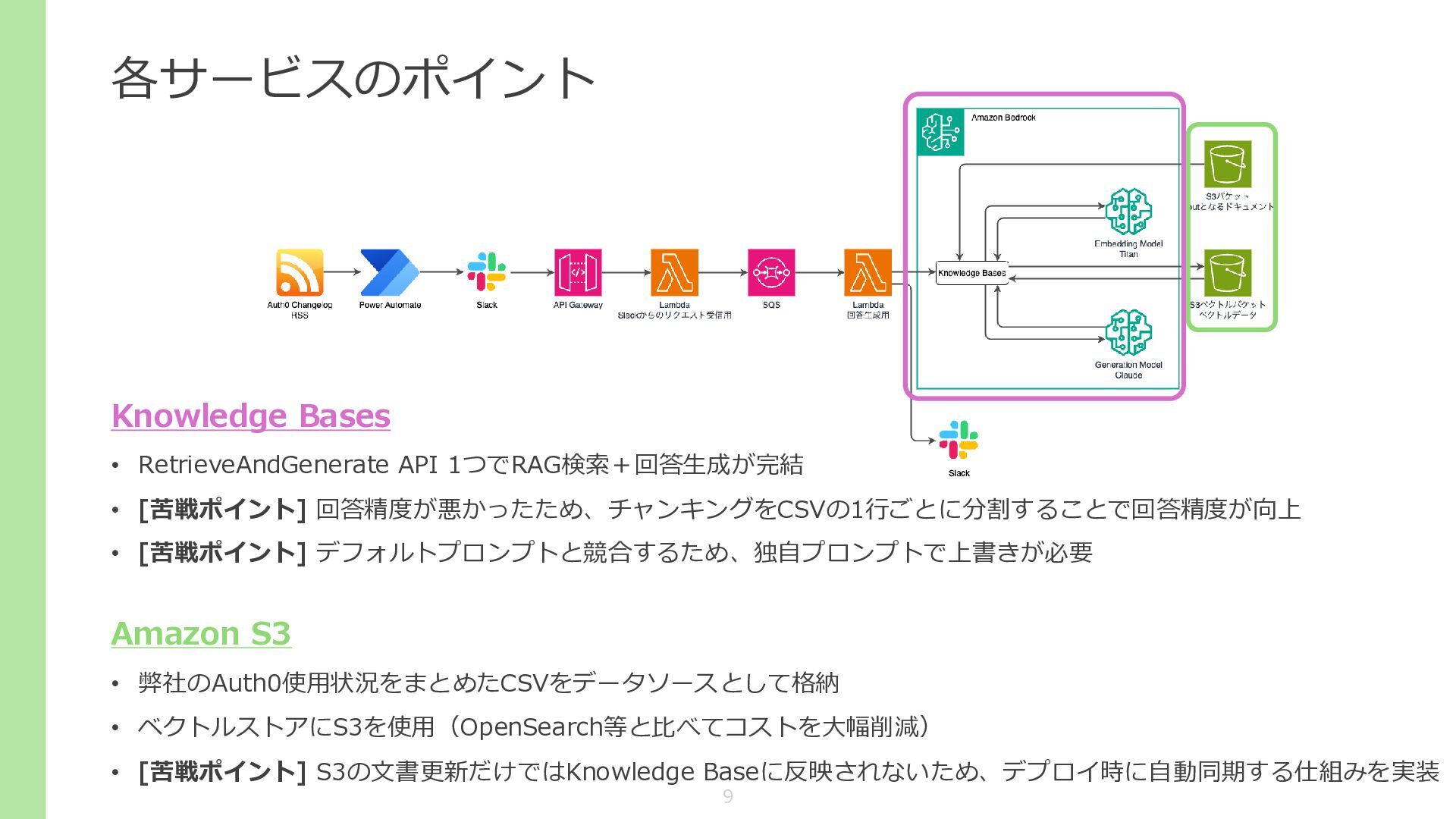 • [苦戦ポイント] デフォルトプロンプトと競合するため、独自プロンプトで上書きが必要 Amazon S3 • 弊社のAuth0使用状況をまとめたCSVをデータソースとして格納 • ベクトルストアにS3を使用(OpenSearch等と比べてコストを大幅削減) • [苦戦ポイント] S3の文書更新だけではKnowledge Baseに反映されないため、デプロイ時に自動同期する仕組みを実装 9