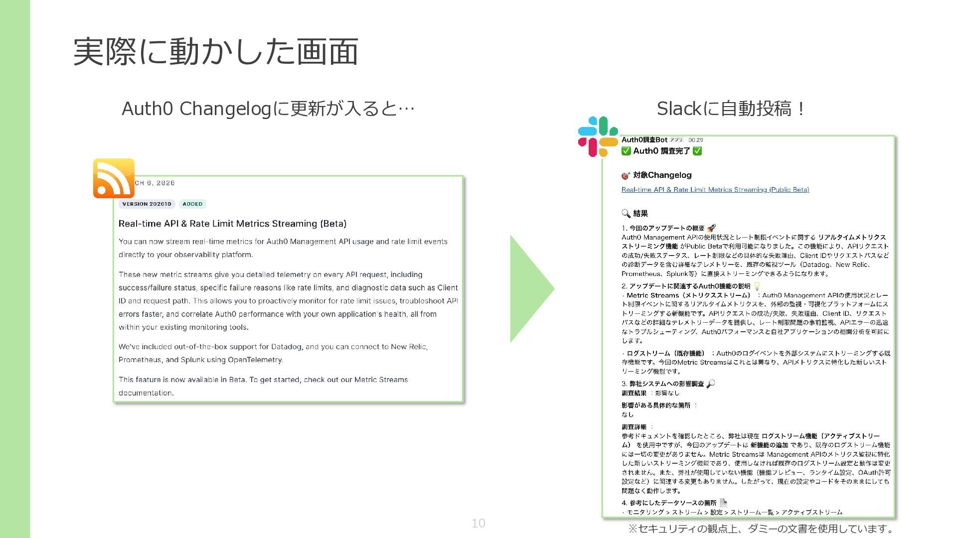 実際に動かした画面 ※セキュリティの観点上、ダミーの文書を使用しています。 Auth0 Changelogに更新が入ると… Slackに自動投稿! 10