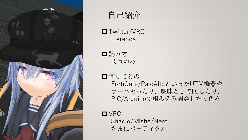 自己紹介 Twitter/VRC t_erenoa 読み方 えれのあ 何してるの FortiGate/PaloAltoといったUTM機器や