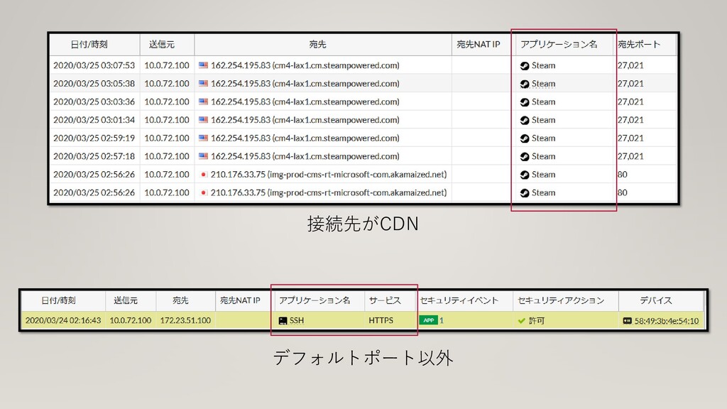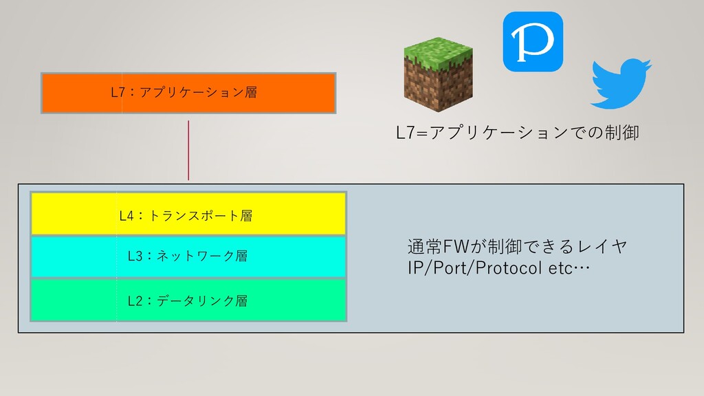 L2:データリンク層 L3:ネットワーク層 L4:トランスポート層 L7:アプリケーション層 通常FWが制御できるレイヤ IP/Port/Protocol etc… L7=アプリケーションでの制御