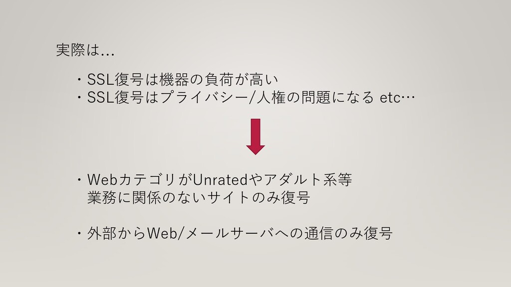 実際は… ・SSL復号は機器の負荷が高い ・SSL復号はプライバシー/人権の問題になる etc… ・WebカテゴリがUnratedやアダルト系等 業務に関係のないサイトのみ復号 ・外部からWeb/メールサーバへの通信のみ復号