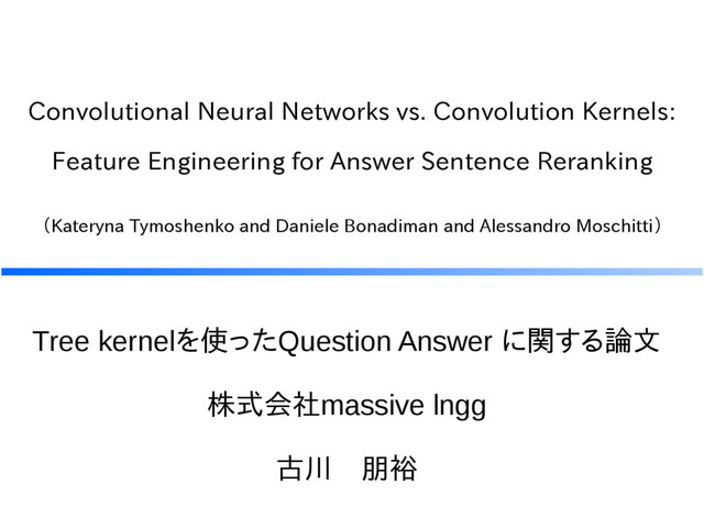 Moschitti http://disi.unitn.it/moschitti/Teaching-slides/TK-ECML2006.pdf [2]SIGIR2012勉強会 23 Learning to Rank 数原良彦 http://www.slideshare.net/sleepy_yoshi/sigir2012-23-learning-to-rank [3]Structural Relationships for Large-Scale Learning of Answer Re-ranking Aliaksei Severyn and Alessandro Moschitti http://disi.unitn.it/moschitti/articles/2012/SIGIR2012.pdf [4]TREE KERNELS IN SVM-LIGHT Alessandro Moschitti http://disi.unitn.it/moschitti/Tree-Kernel.htm [5]WIKIQA: A Challenge Dataset for Open-Domain Question Answering Yi Yang, Wen-tau Yih, and Christopher Meek https://www.microsoft.com/en-us/research/wp-content/uploads/2016/02/YangYihMeek_EMNLP-15_WikiQA.pdf 参考文献
