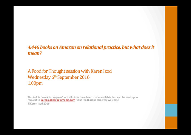 With the fashion to call any and every approach to engaging with others ‘relational’ what does relational actually mean? Karen Izod gave us a snapshot of ideas on what relational practice means to her, and how it is embodied in her work as a consultant to organisational change and professional development.