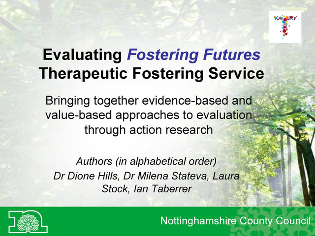 Evaluating Fostering Futures therapeutic fostering service through action research: bringing together evidence and value-based approaches to evaluation. A presentation given by Laura Stock, Ian Taberrer and Dr Dione Hills, to the UK Evaluation Society.