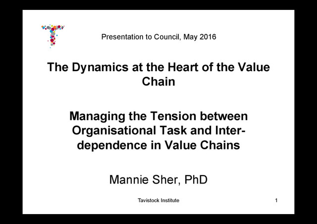 through which the product moves have boundaries that encompass professionals, work activities and supplier/customer organisations. • Organisations and companies in the value chain have to rely on the skill, experience and integrity of their professionals to do what is necessary; • Profes-sionals have to loosen their commitment to their employing companies as they work together in cross-company teams to strengthen each other’s companies in the value chain. • These inter-dependencies give rise to fears of loss of loyalty, dilution of resource availability as employees identify with the organisations to which they are seconded or with which they work closely. • Implicit in the manufacturer-supplier and in the manufacturer-customer relationship is the possibility of failure, with corresponding anxieties, conscious or unconscious, that the supplier’s and the customer’s problems may be disruptive or the manufacturer’s skills may be inadequate. • The more there is at stake, the more intense the confused and ambivalent feelings associated with the inter-dependence in the value chain are likely to be. Tavistock Institute 23