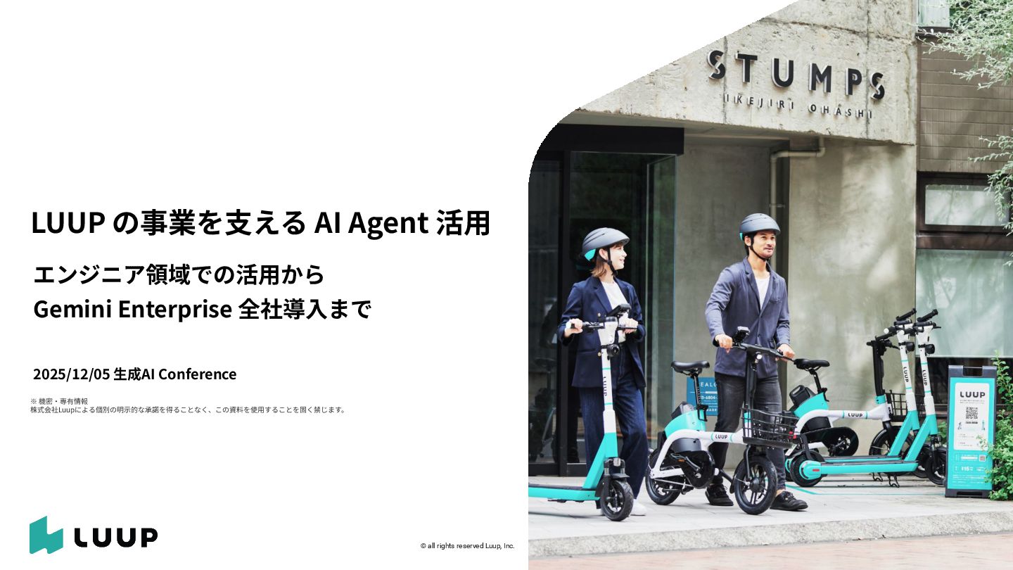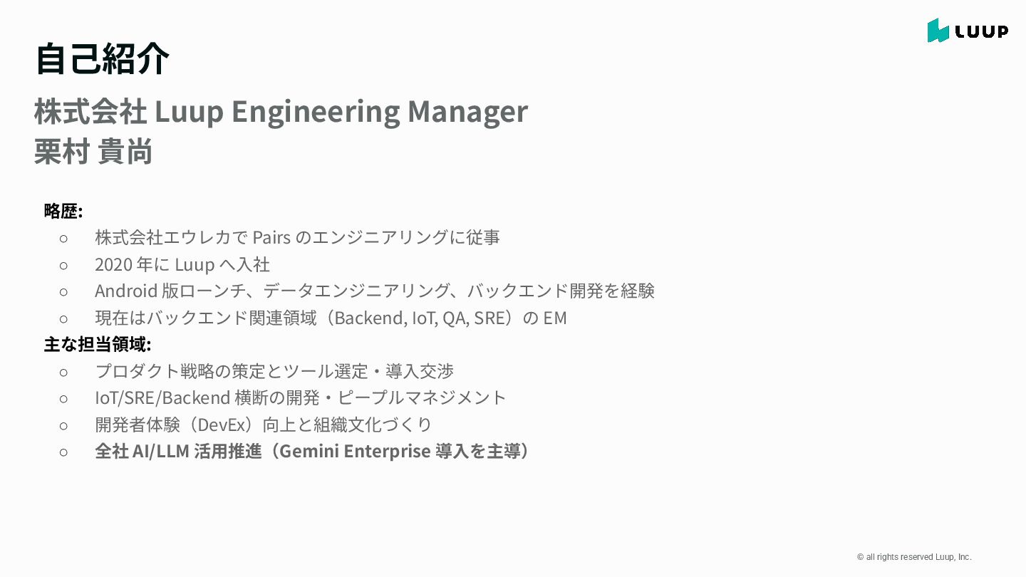 のエンジニアリングに従事 ◦ 2020 年に Luup へ⼊社 ◦ Android 版ローンチ、データエンジニアリング、バックエンド開発を経験 ◦ 現在はバックエンド関連領域(Backend, IoT, QA, SRE)の EM 主な担当領域: ◦ プロダクト戦略の策定とツール選定‧導⼊交渉 ◦ IoT/SRE/Backend 横断の開発‧ピープルマネジメント ◦ 開発者体験(DevEx)向上と組織⽂化づくり ◦ 全社 AI/LLM 活⽤推進(Gemini Enterprise 導⼊を主導) ⾃⼰紹介 株式会社 Luup Engineering Manager 栗村 貴尚