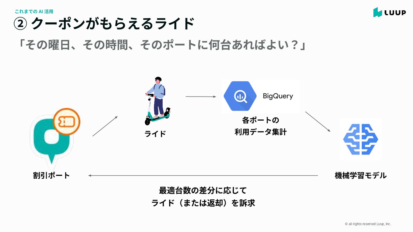 © all rights reserved Luup, Inc. ② クーポンがもらえるライド 「その曜⽇、その時間、そのポートに何台あればよい?」 これまでの