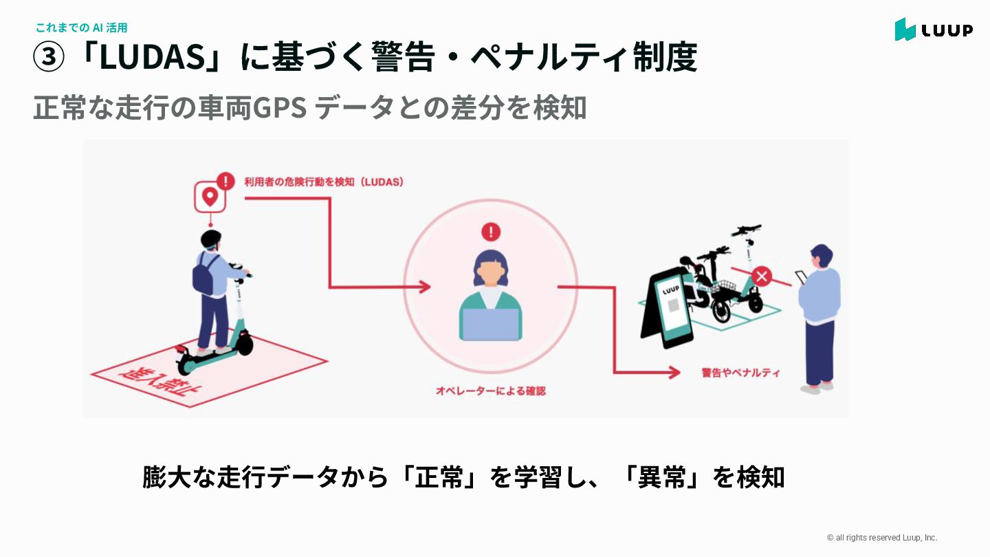 © all rights reserved Luup, Inc. 膨⼤な⾛⾏データから「正常」を学習し、「異常」を検知 ③「LUDAS」に基づく警告‧ペナルティ制度 正常な⾛⾏の⾞両GPS データとの差分を検知