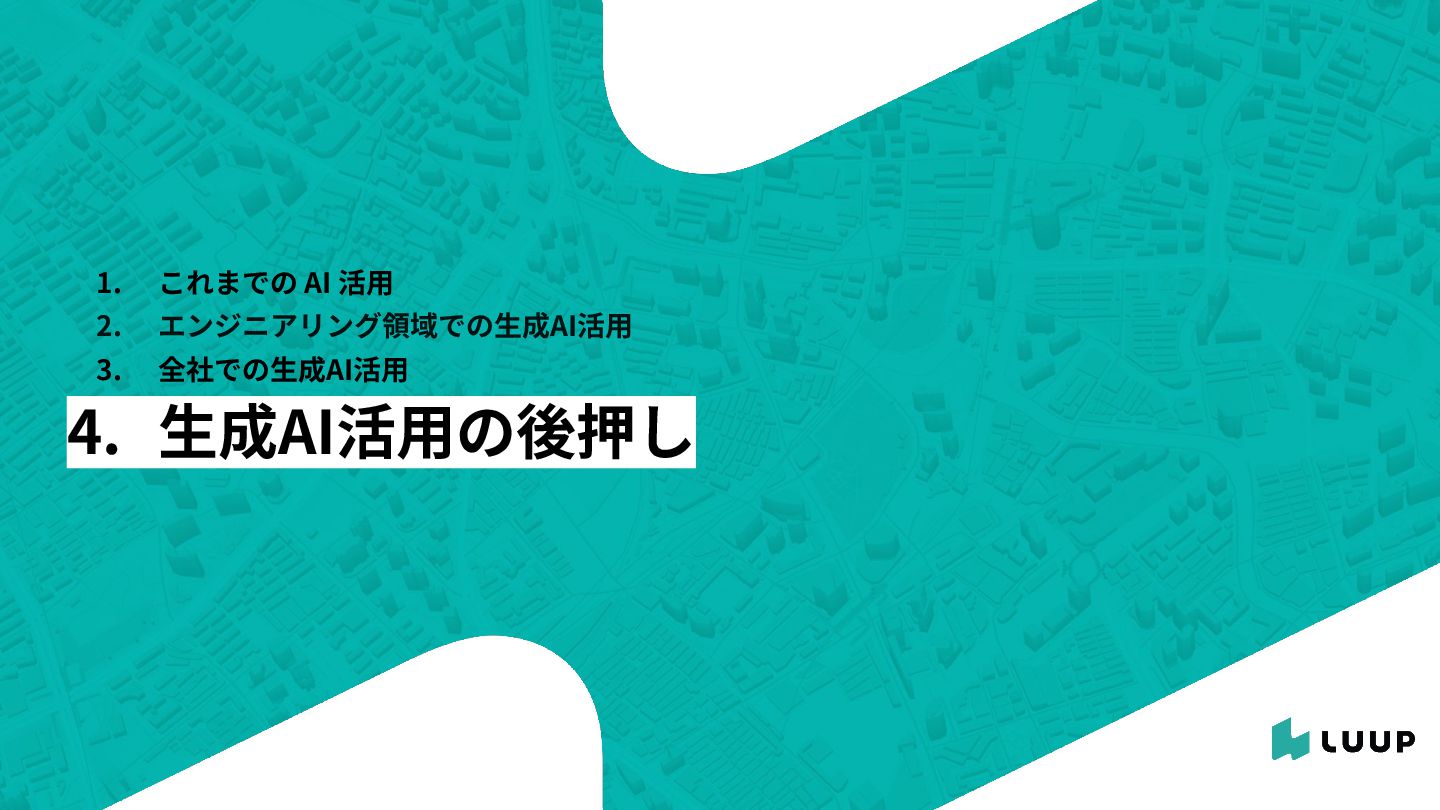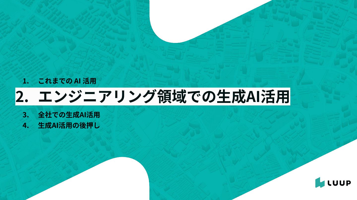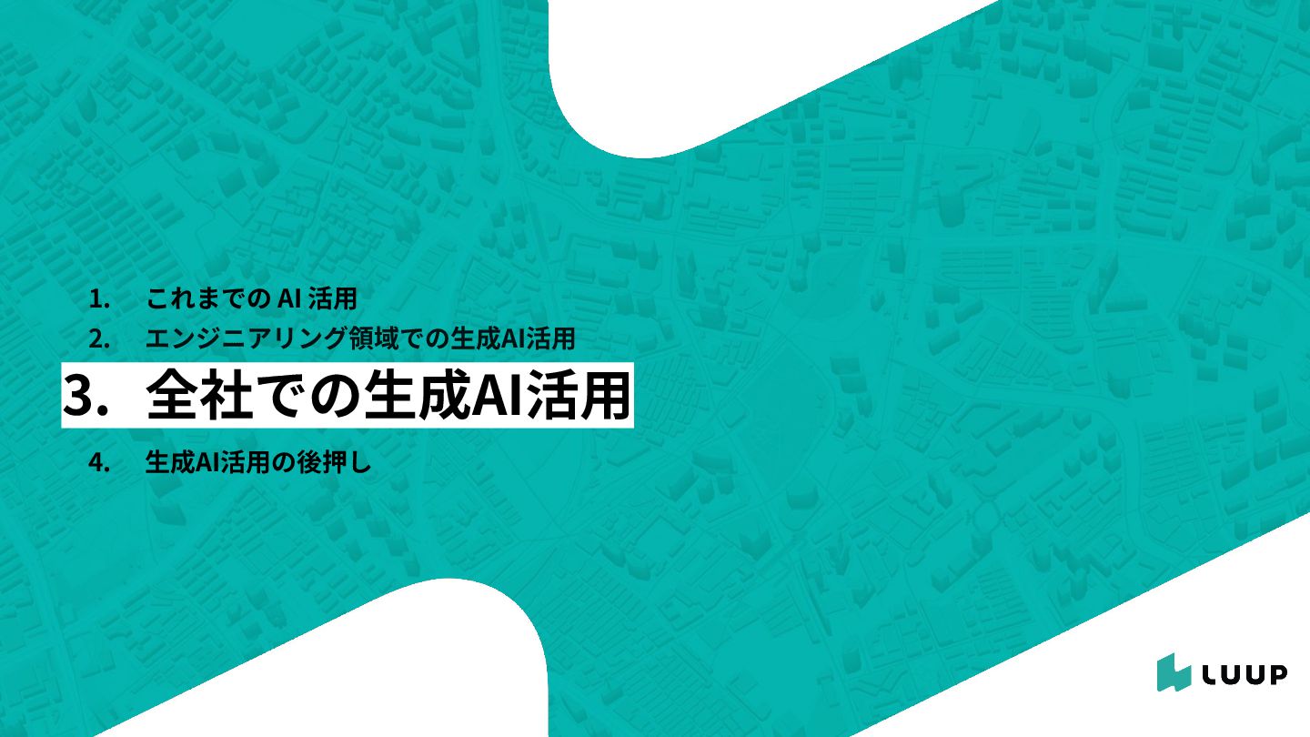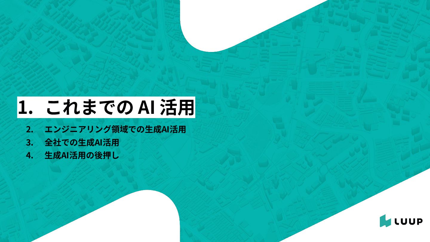 扉ページのタイトルが⼊る 1. これまでの AI 活⽤ 2. エンジニアリング領域での⽣成AI活⽤ 3. 全社での⽣成AI活⽤ 4.
