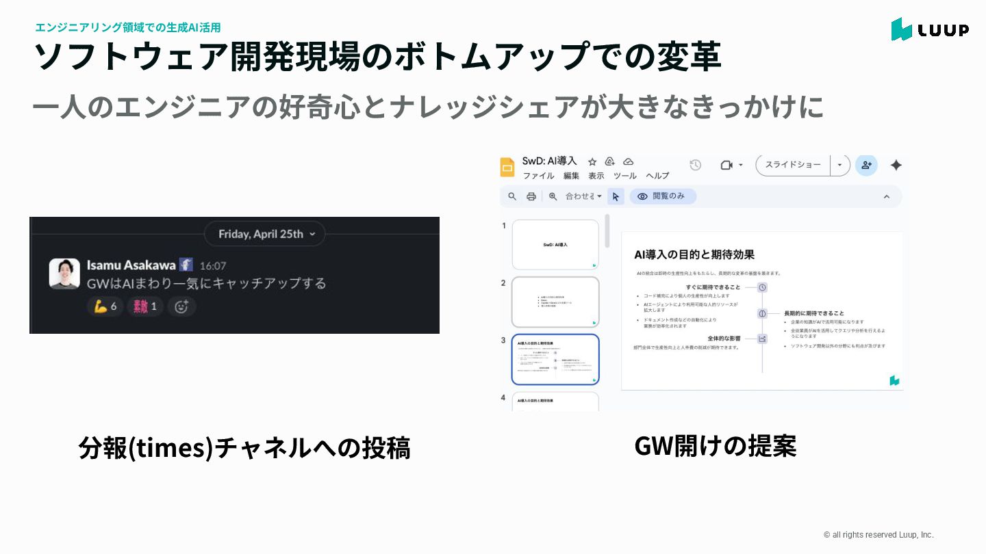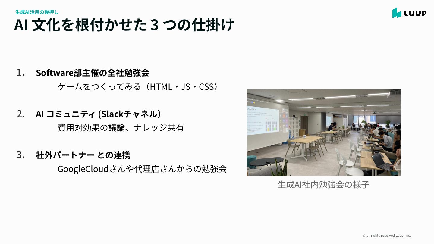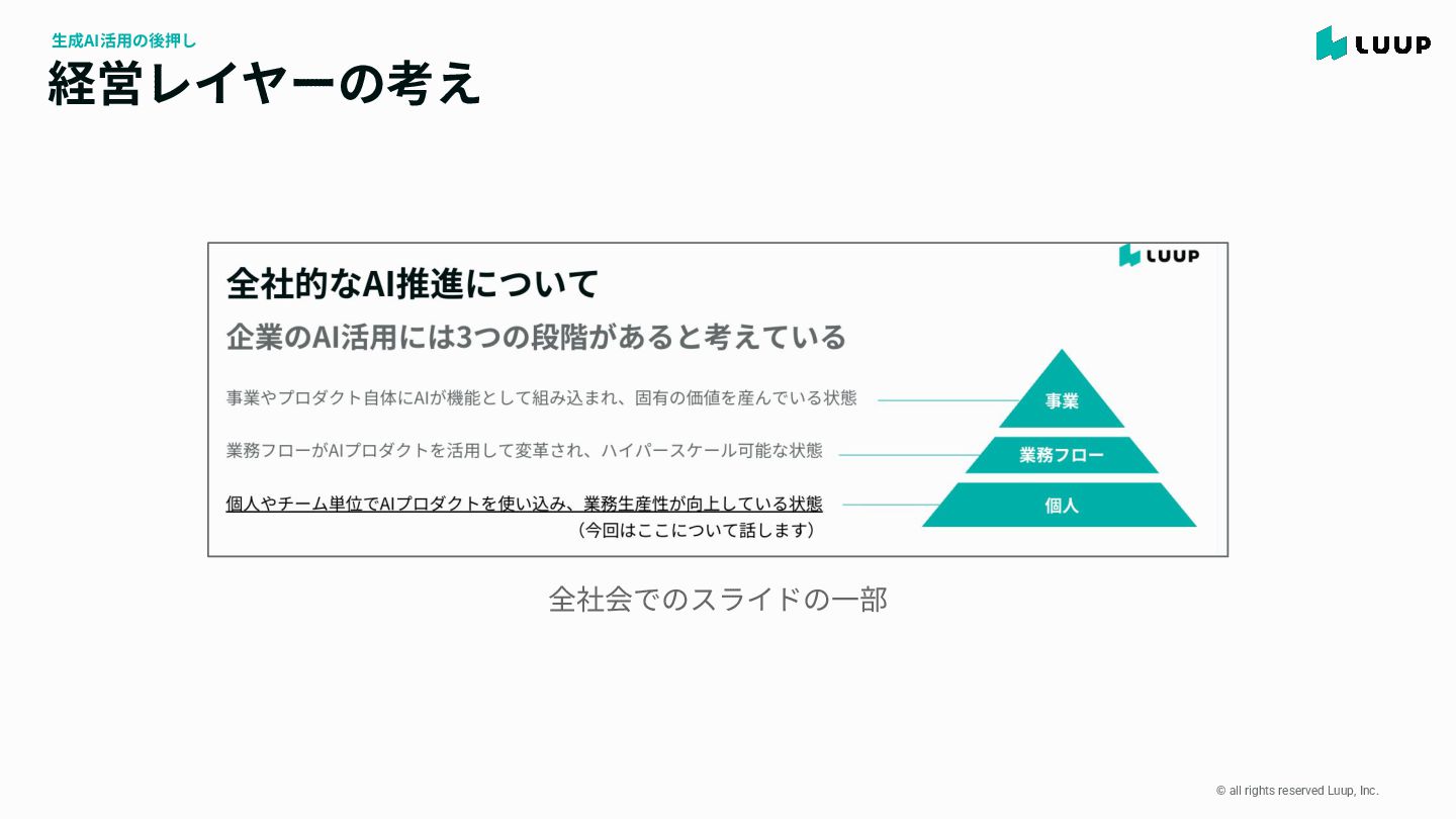 © all rights reserved Luup, Inc. 経営レイヤーの考え ⽣成AI活⽤の後押し 全社会でのスライドの⼀部
