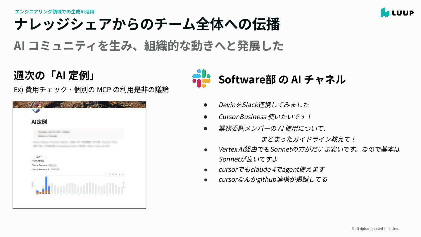 MCP の利⽤是⾮の議論 Software部 の AI チャネル • DevinをSlack連携してみました • Cursor Business 使いたいです! • 業務委託メンバーの AI 使⽤について、 まとまったガイドライン教えて! • Vertex AI経由でもSonnetの⽅がだいぶ安いです。なので基本は Sonnetが良いですよ • cursorでもclaude 4でagent使えます • cursorなんかgithub連携が爆誕してる ナレッジシェアからのチーム全体への伝播 AI コミュニティを⽣み、組織的な動きへと発展した エンジニアリング領域での⽣成AI活⽤