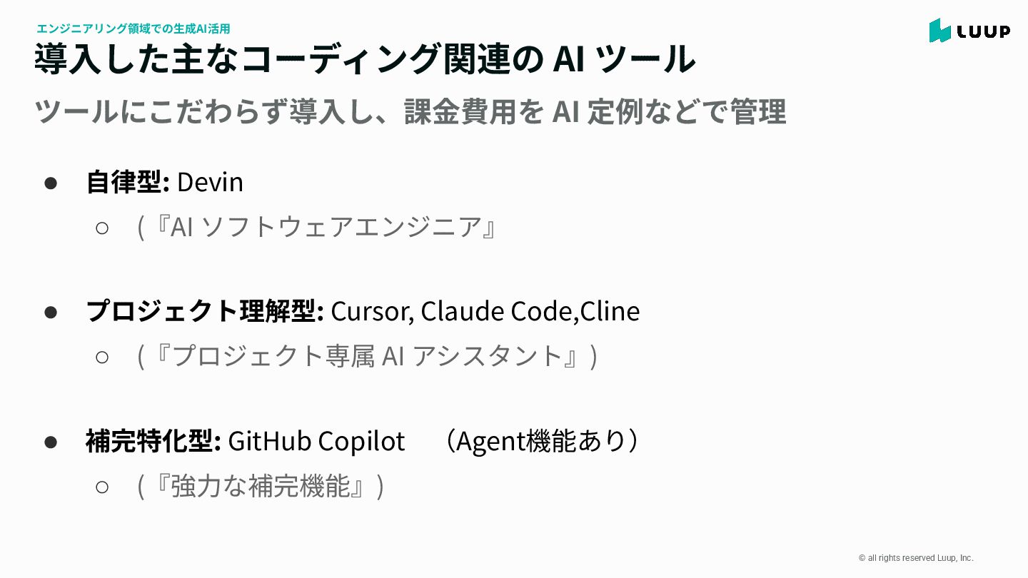 © all rights reserved Luup, Inc. 導⼊した主なコーディング関連の AI ツール ツールにこだわらず導⼊し、課⾦費⽤を