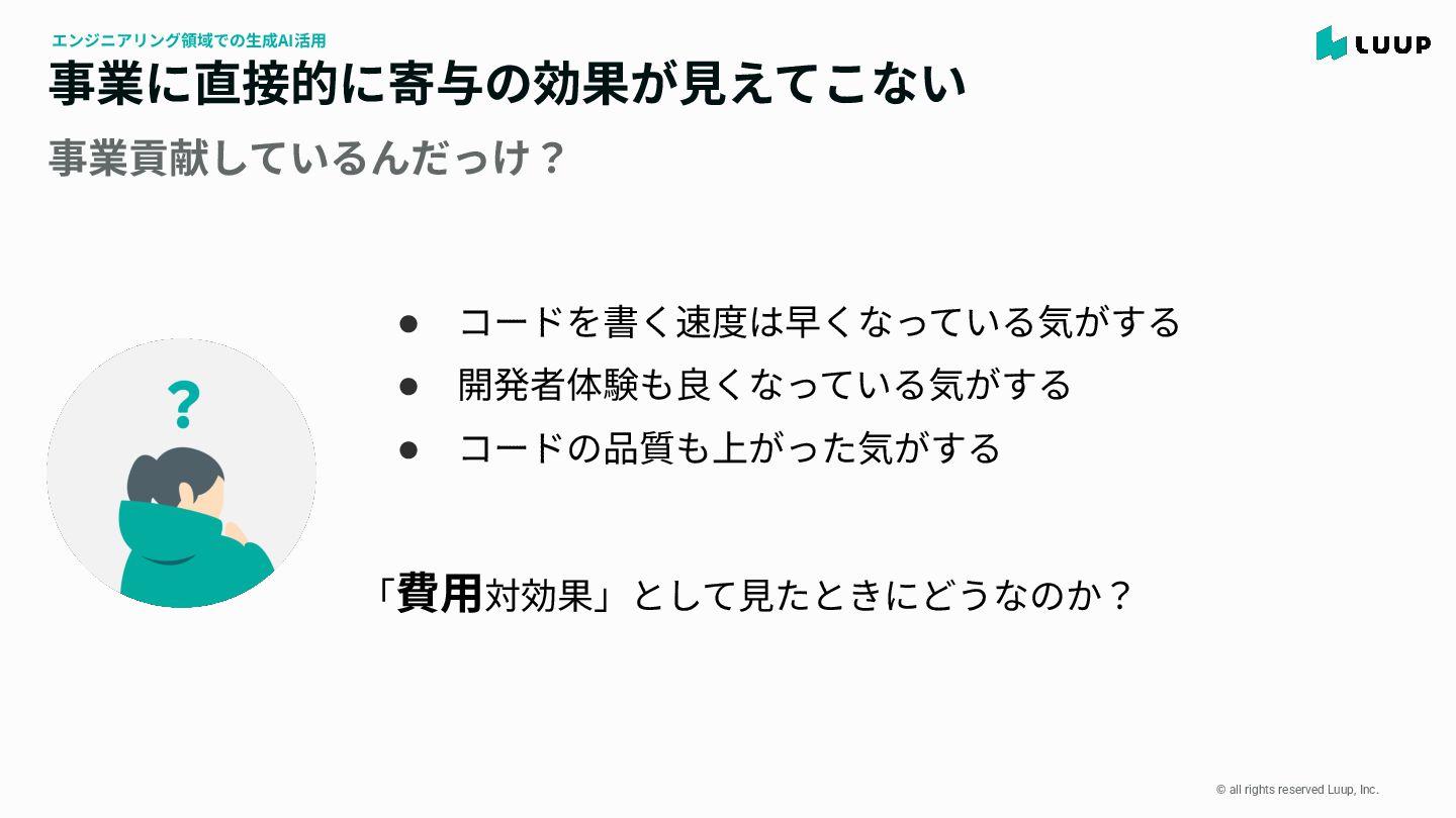 © all rights reserved Luup, Inc. 「費⽤対効果」として⾒たときにどうなのか? 事業に直接的に寄与の効果が⾒えてこない 事業貢献しているんだっけ? エンジニアリング領域での⽣成AI活⽤