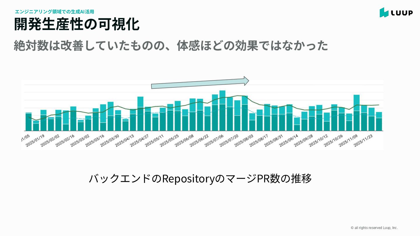 © all rights reserved Luup, Inc. 開発⽣産性の可視化 絶対数は改善していたものの、体感ほどの効果ではなかった エンジニアリング領域での⽣成AI活⽤ バックエンドのRepositoryのマージPR数の推移