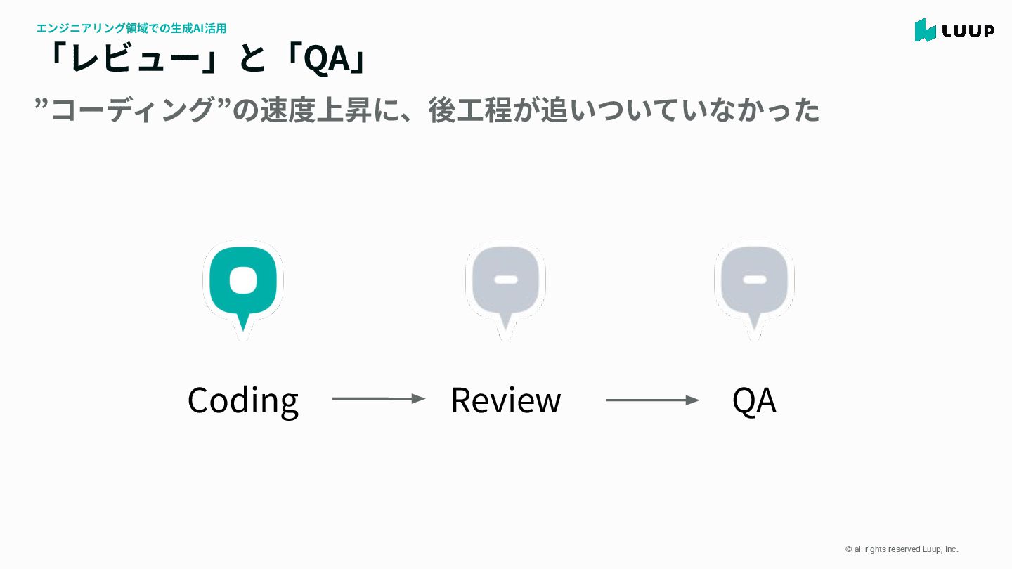 © all rights reserved Luup, Inc. 「レビュー」と「QA」 ”コーディング”の速度上昇に、後⼯程が追いついていなかった エンジニアリング領域での⽣成AI活⽤ Coding