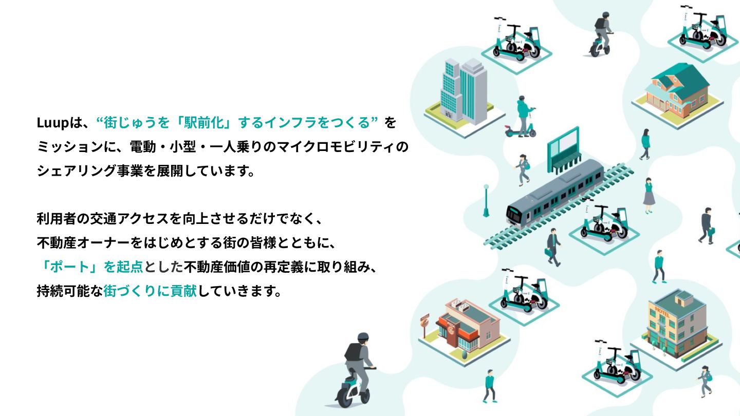 Luupは、“街じゅうを「駅前化」するインフラをつくる” を ミッションに、電動‧⼩型‧⼀⼈乗りのマイクロモビリティの シェアリング事業を展開しています。 利⽤者の交通アクセスを向上させるだけでなく、 不動産オーナーをはじめとする街の皆様とともに、 「ポート」を起点とした不動産価値の再定義に取り組み、 持続可能な街づくりに貢献していきます。