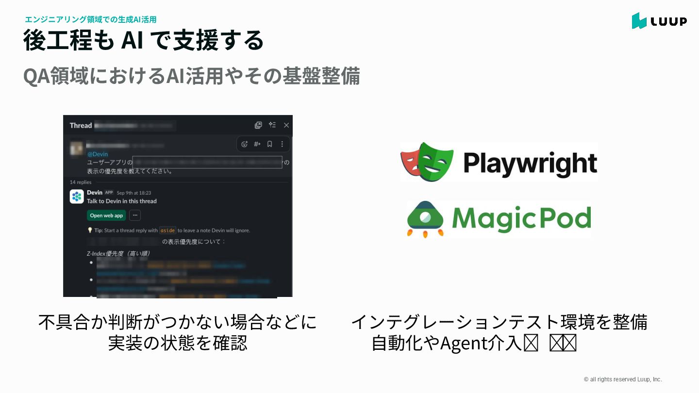 © all rights reserved Luup, Inc. 後⼯程も AI で⽀援する QA領域におけるAI活⽤やその基盤整備