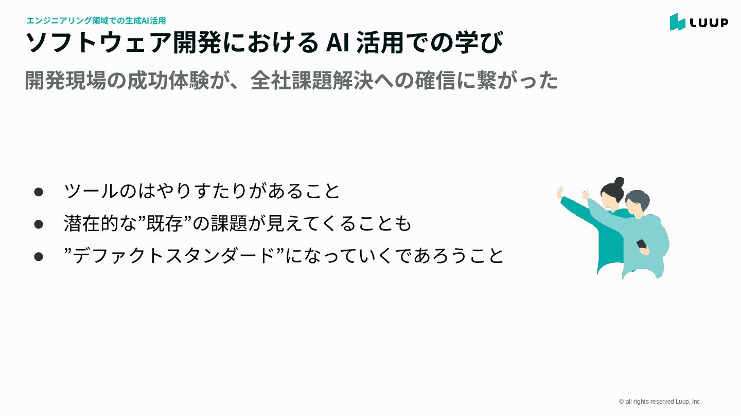 • ”デファクトスタンダード”になっていくであろうこと ソフトウェア開発における AI 活⽤での学び 開発現場の成功体験が、全社課題解決への確信に繋がった エンジニアリング領域での⽣成AI活⽤