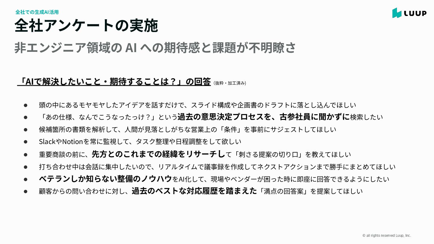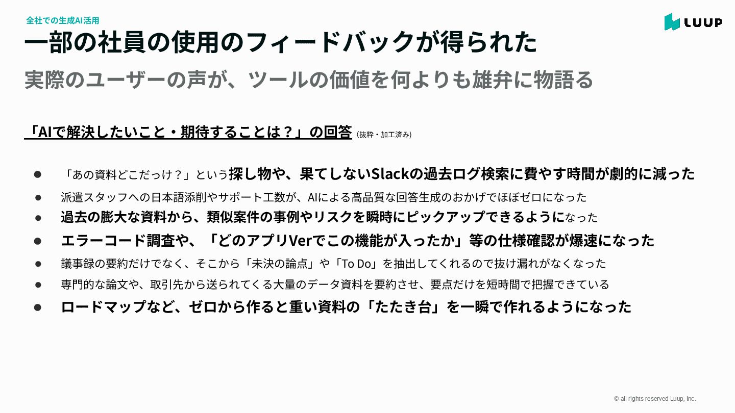 © all rights reserved Luup, Inc. 「AIで解決したいこと‧期待することは?」の回答(抜粋‧加⼯済み) • 「あの資料どこだっけ?」という探し物や、果てしないSlackの過去ログ検索に費やす時間が劇的に減った •
