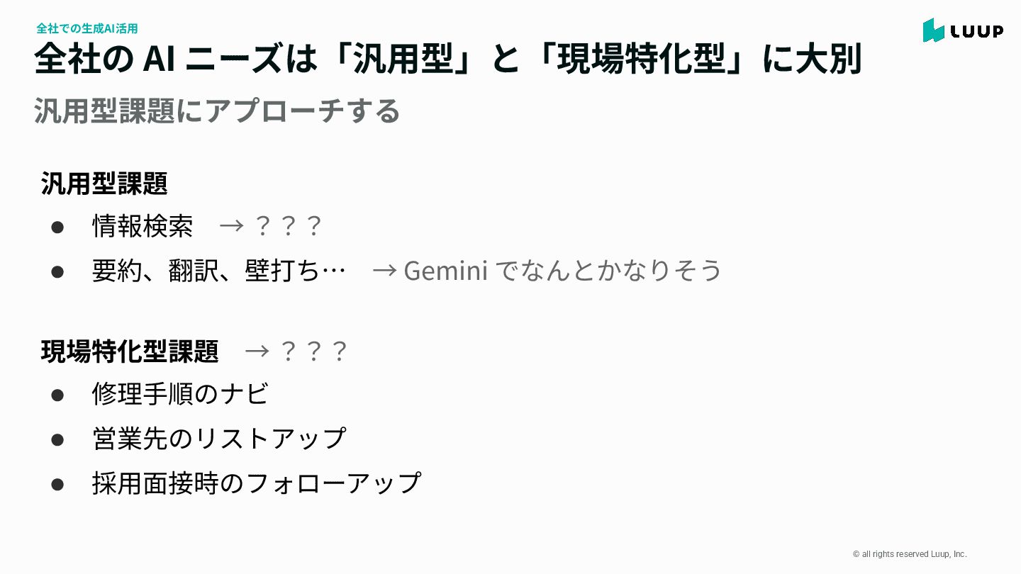 • 要約、翻訳、壁打ち… → Gemini でなんとかなりそう 現場特化型課題 → ??? • 修理⼿順のナビ • 営業先のリストアップ • 採⽤⾯接時のフォローアップ 全社の AI ニーズは「汎⽤型」と「現場特化型」に⼤別 汎⽤型課題にアプローチする 全社での⽣成AI活⽤