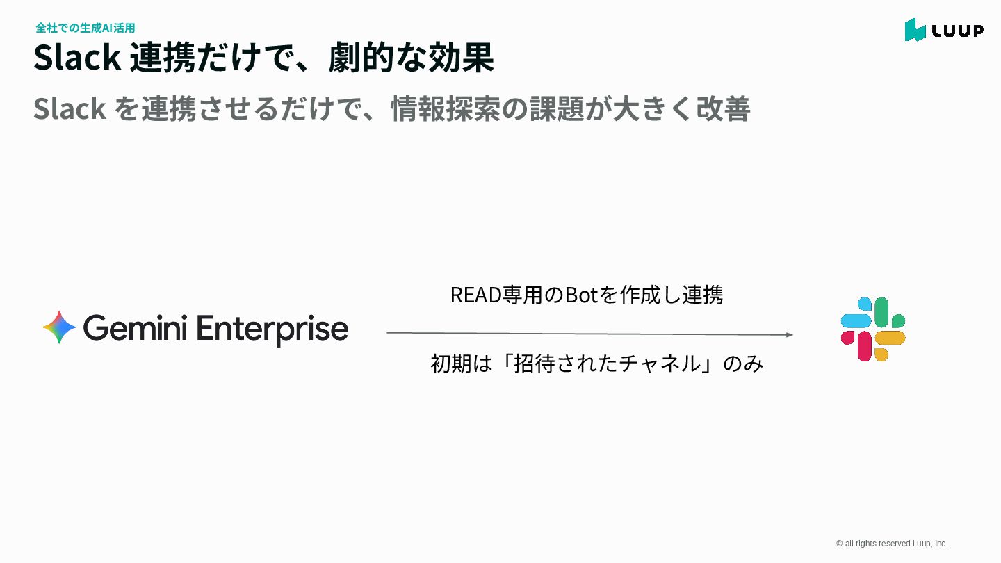 © all rights reserved Luup, Inc. Slack 連携だけで、劇的な効果 Slack を連携させるだけで、情報探索の課題が⼤きく改善