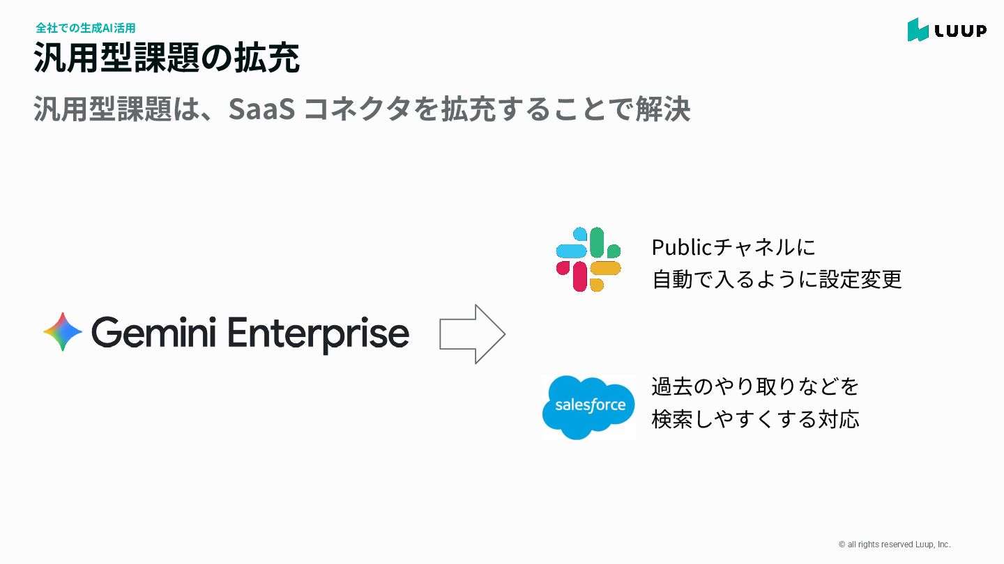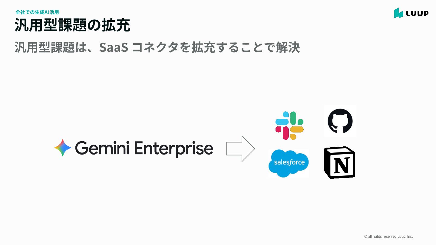 © all rights reserved Luup, Inc. 汎⽤型課題の拡充 汎⽤型課題は、SaaS コネクタを拡充することで解決 全社での⽣成AI活⽤