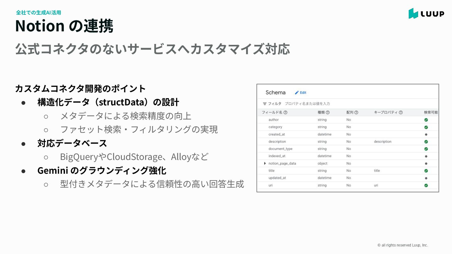 メタデータによる検索精度の向上 ◦ ファセット検索‧フィルタリングの実現 • 対応データベース ◦ BigQueryやCloudStorage、Alloyなど • Gemini のグラウンディング強化 ◦ 型付きメタデータによる信頼性の⾼い回答⽣成 Notion の連携 公式コネクタのないサービスへカスタマイズ対応 全社での⽣成AI活⽤
