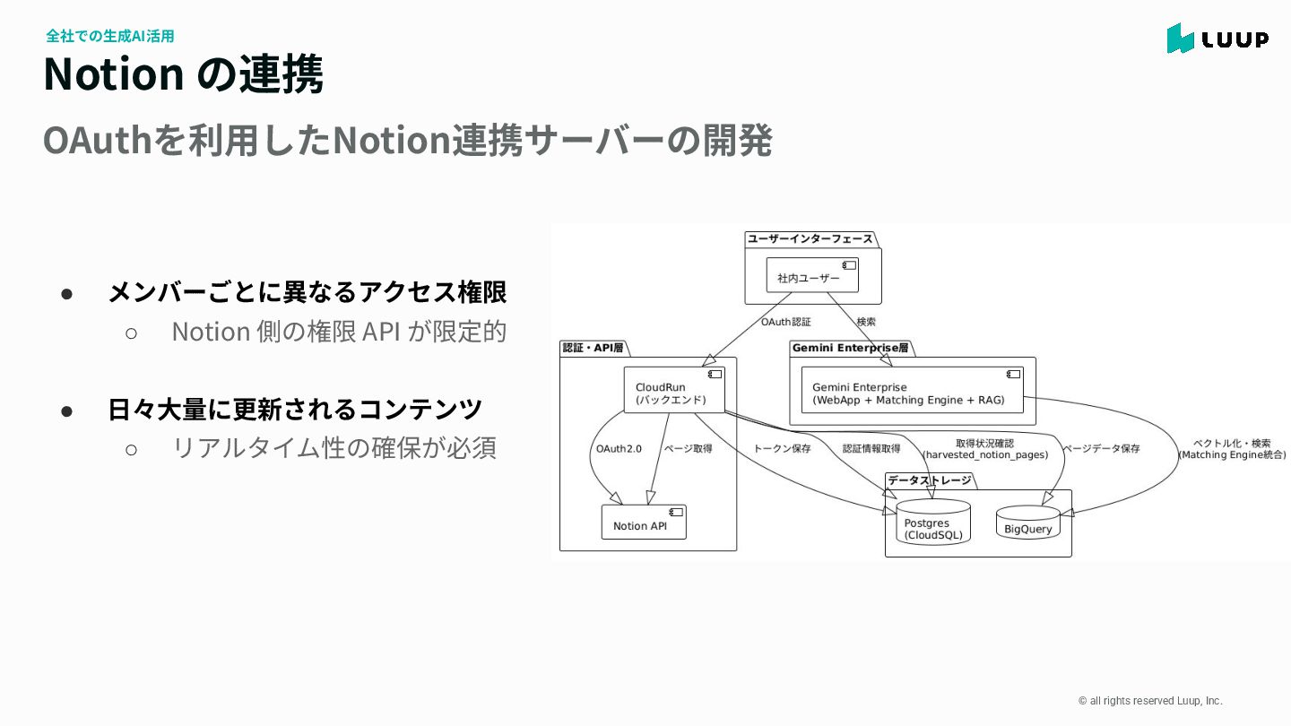 側の権限 API が限定的 • ⽇々⼤量に更新されるコンテンツ ◦ リアルタイム性の確保が必須 Notion の連携 OAuthを利⽤したNotion連携サーバーの開発 全社での⽣成AI活⽤