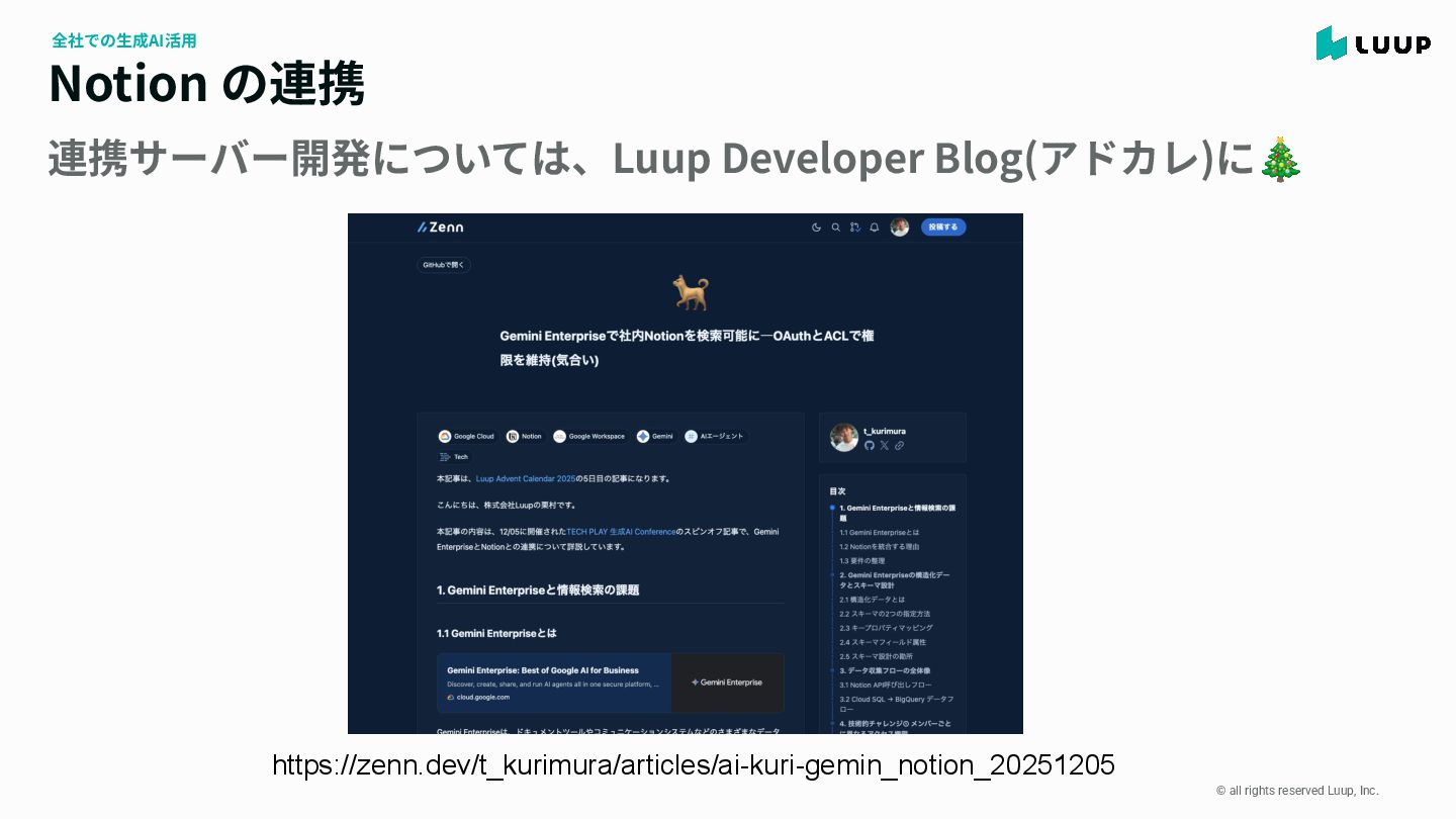 Blog(アドカレ)に🎄 全社での⽣成AI活⽤ https://zenn.dev/t_kurimura/articles/ai-kuri-gemin_notion_20251205