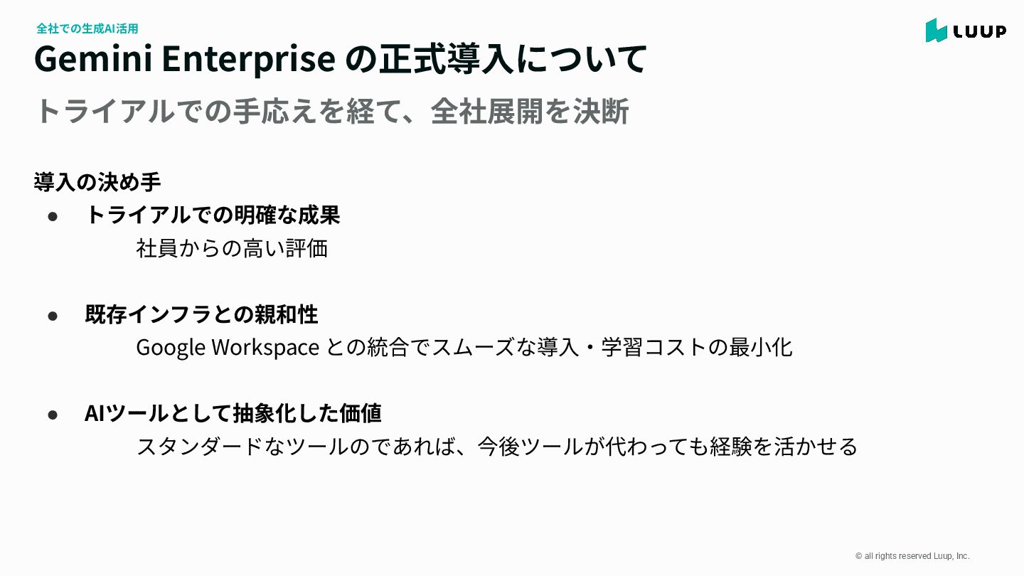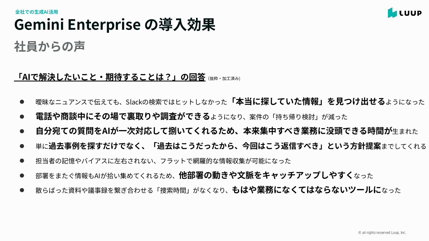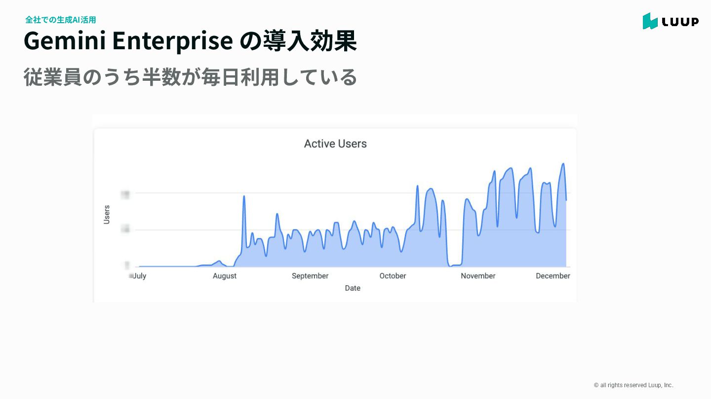 © all rights reserved Luup, Inc. Gemini Enterprise の導⼊効果 従業員のうち半数が毎⽇利⽤している