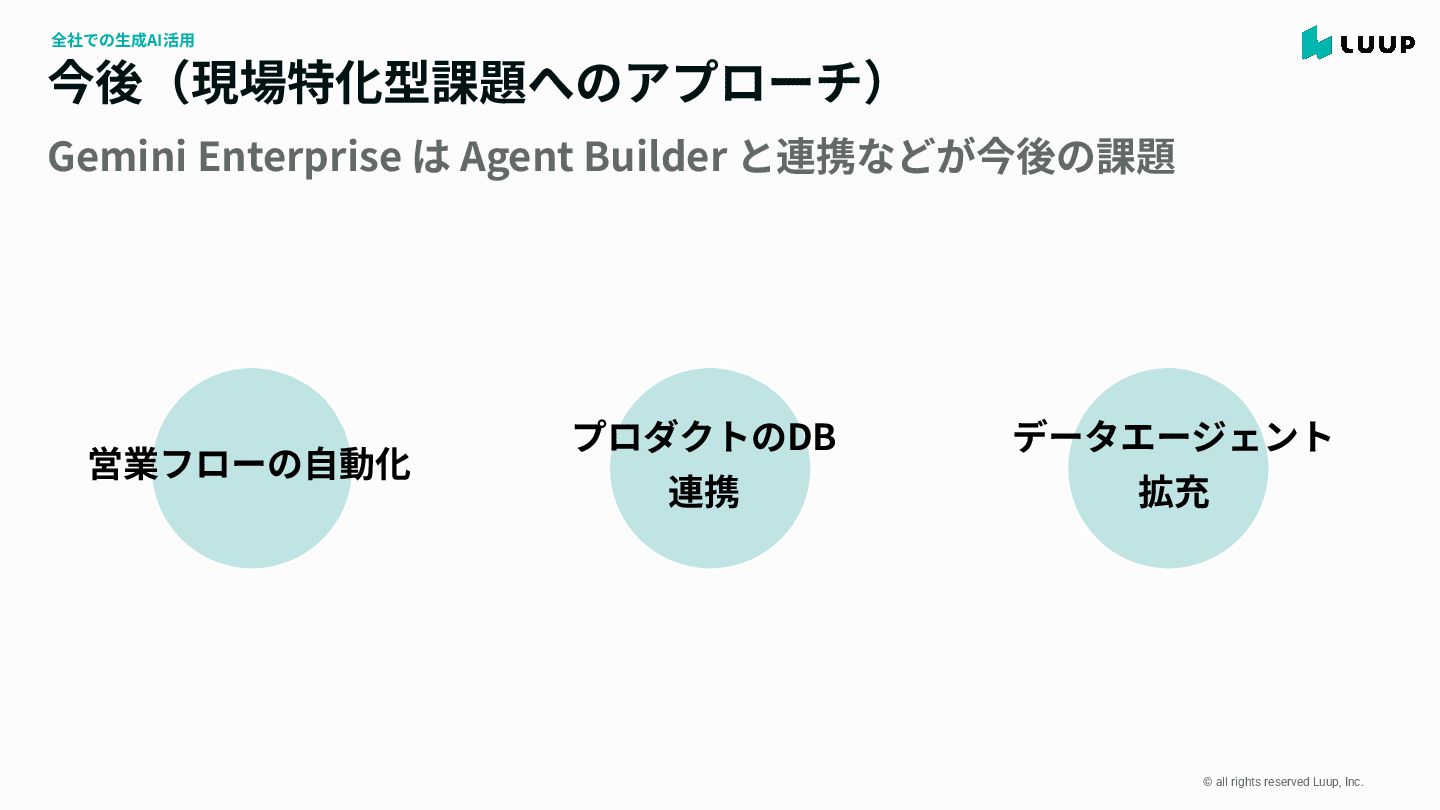 © all rights reserved Luup, Inc. 営業フローの⾃動化 今後(現場特化型課題へのアプローチ) Gemini Enterprise