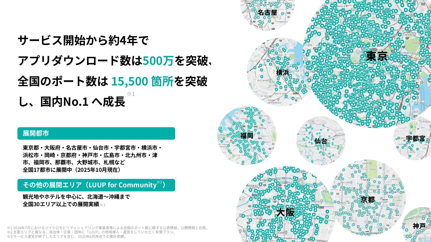 市、福岡市、那覇市、⼤野城市、札幌など 全国17都市に展開中(2025年10⽉現在) その他の展開エリア(LUUP for Community ) 観光地やホテルを中⼼に、北海道〜沖縄まで 全国30エリア以上での展開実績 ※1 ※1 2024年7⽉におけるマイクロモビリティシェアリング事業者等による全国のポート数に関する公表情報、公開情報と⽐較。 ※2 主要エリアと異なる、⾃治体‧企業‧団体に「LUUP」の地域導⼊‧運営をしていただく有償プラン。 ※3 サービス運営が終了したエリアを含む、2025年6⽉時点での累計実績。 ※3 ※2