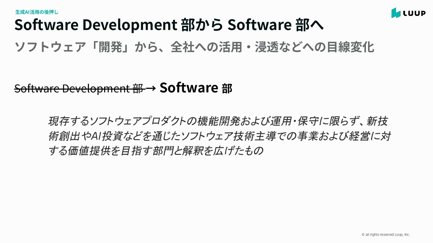 Software 部 Software Development 部から Software 部へ ソフトウェア「開発」から、全社への活⽤‧浸透などへの⽬線変化 ⽣成AI活⽤の後押し 現存するソフトウェアプロダクトの機能開発および運用・保守に限らず、新技 術創出やAI投資などを通じたソフトウェア技術主導での事業および経営に対 する価値提供を目指す部門と解釈を広げたもの