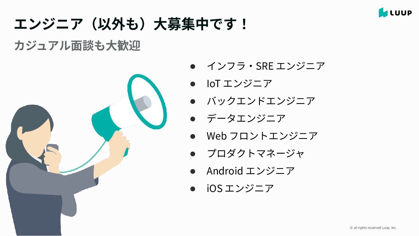 IoT エンジニア • バックエンドエンジニア • データエンジニア • Web フロントエンジニア • プロダクトマネージャ • Android エンジニア • iOS エンジニア エンジニア(以外も)⼤募集中です! カジュアル⾯談も⼤歓迎