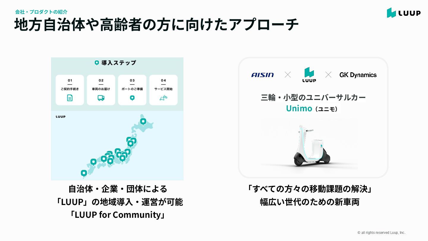 Community」 地⽅⾃治体や⾼齢者の⽅に向けたアプローチ 会社‧プロダクトの紹介 三輪‧⼩型のユニバーサルカー Unimo(ユニモ) 「すべての⽅々の移動課題の解決」 幅広い世代のための新⾞両