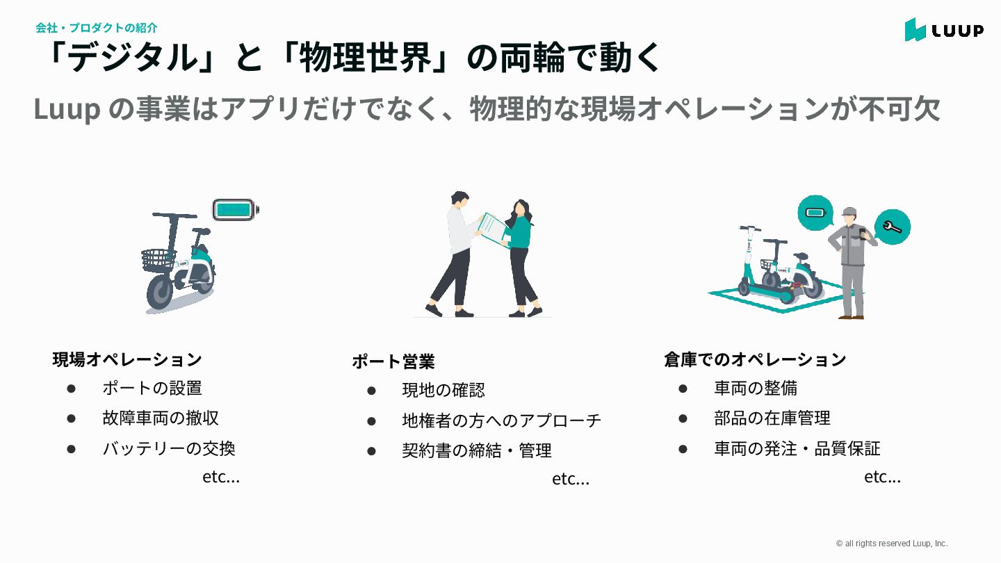 故障⾞両の撤収 • バッテリーの交換 etc... ポート営業 • 現地の確認 • 地権者の⽅へのアプローチ • 契約書の締結‧管理 etc... 「デジタル」と「物理世界」の両輪で動く Luup の事業はアプリだけでなく、物理的な現場オペレーションが不可⽋ 会社‧プロダクトの紹介 倉庫でのオペレーション • ⾞両の整備 • 部品の在庫管理 • ⾞両の発注‧品質保証 etc...