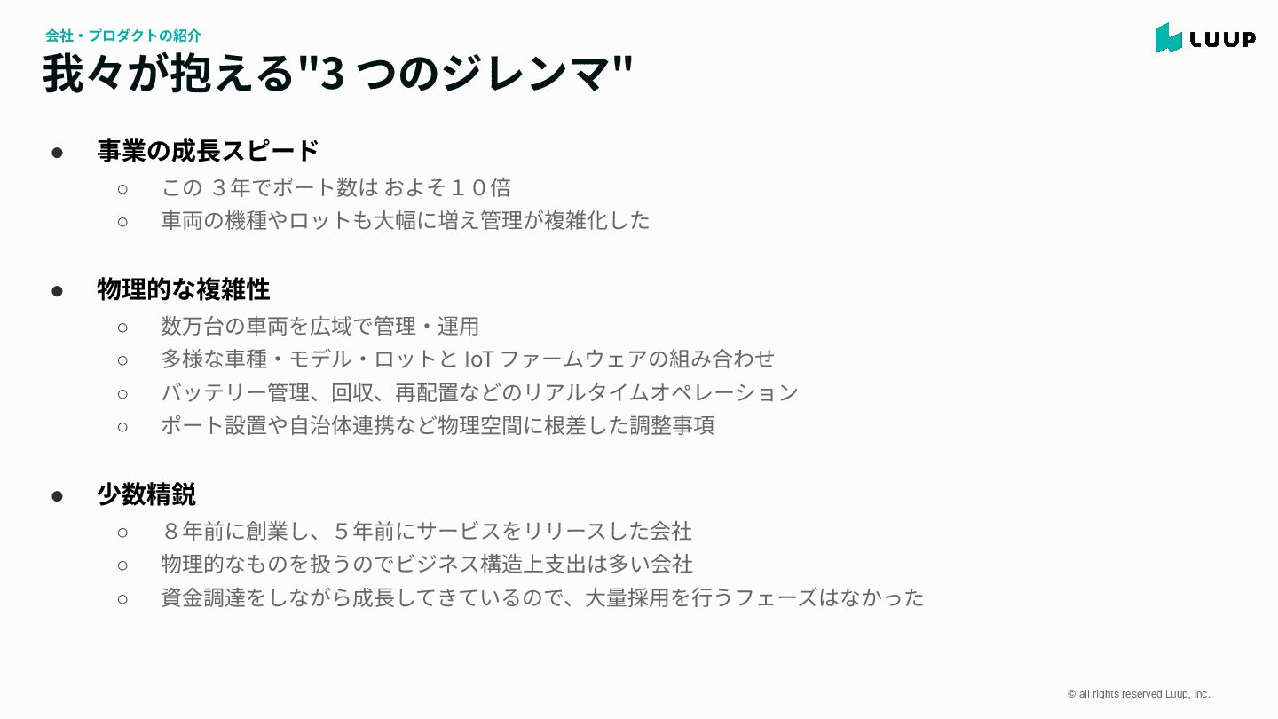 3年でポート数は およそ10倍 ◦ ⾞両の機種やロットも⼤幅に増え管理が複雑化した • 物理的な複雑性 ◦ 数万台の⾞両を広域で管理‧運⽤ ◦ 多様な⾞種‧モデル‧ロットと IoT ファームウェアの組み合わせ ◦ バッテリー管理、回収、再配置などのリアルタイムオペレーション ◦ ポート設置や⾃治体連携など物理空間に根差した調整事項 • 少数精鋭 ◦ 8年前に創業し、5年前にサービスをリリースした会社 ◦ 物理的なものを扱うのでビジネス構造上⽀出は多い会社 ◦ 資⾦調達をしながら成⻑してきているので、⼤量採⽤を⾏うフェーズはなかった 我々が抱える"3 つのジレンマ" 会社‧プロダクトの紹介