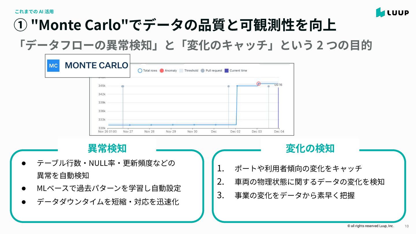 ポートや利⽤者傾向の変化をキャッチ 2. ⾞両の物理状態に関するデータの変化を検知 3. 事業の変化をデータから素早く把握 ① "Monte Carlo"でデータの品質と可観測性を向上 「データフローの異常検知」と「変化のキャッチ」という 2 つの⽬的 これまでの AI 活⽤ • テーブル⾏数‧NULL率‧更新頻度などの 異常を⾃動検知 • MLベースで過去パターンを学習し⾃動設定 • データダウンタイムを短縮‧対応を迅速化