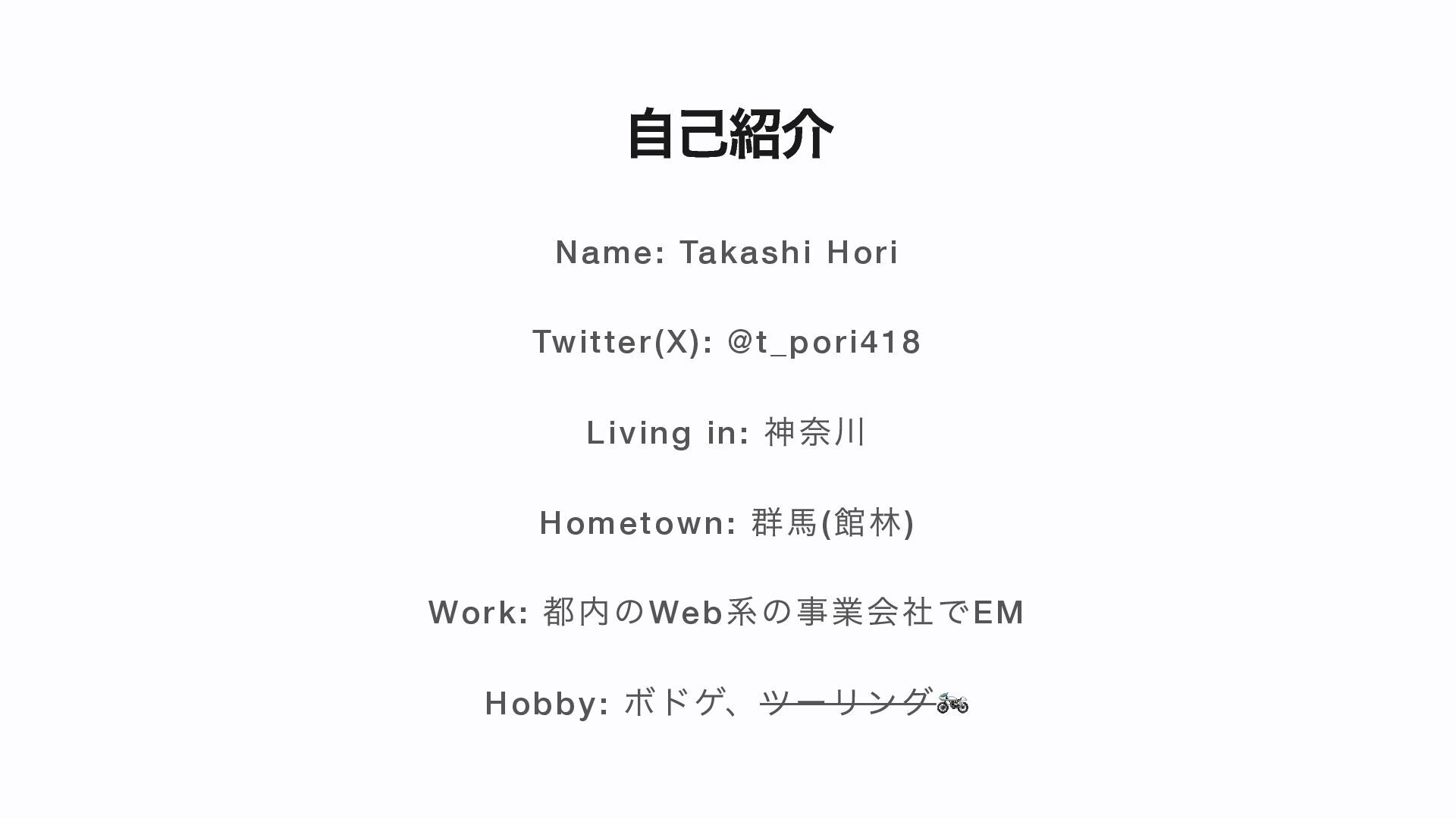 自己紹介 Name: Takashi Hori Twitter(X): @t_pori418 Living in: 神奈川 Hometown:
