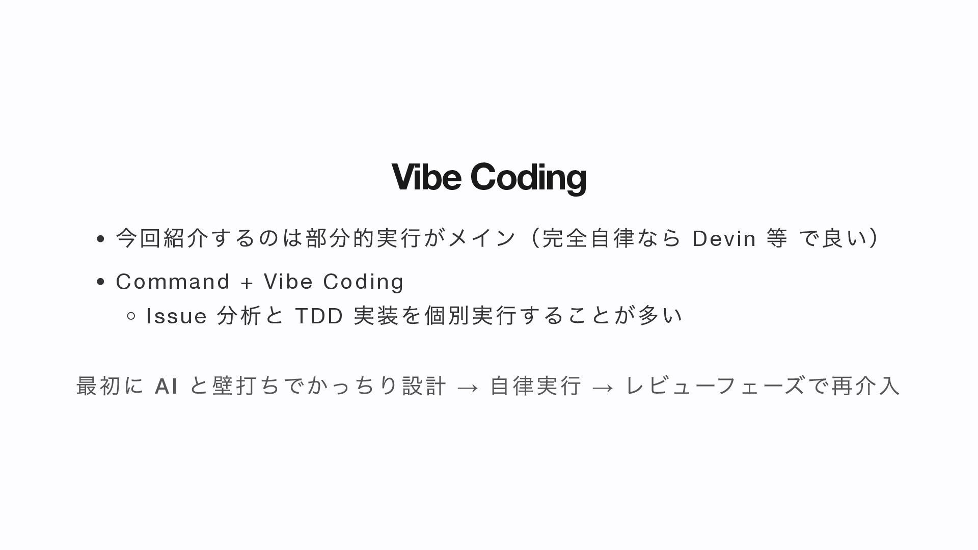 Vibe Coding 今回紹介するのは部分的実行がメイン(完全自律なら Devin 等 で良い) Command + Vibe Coding
