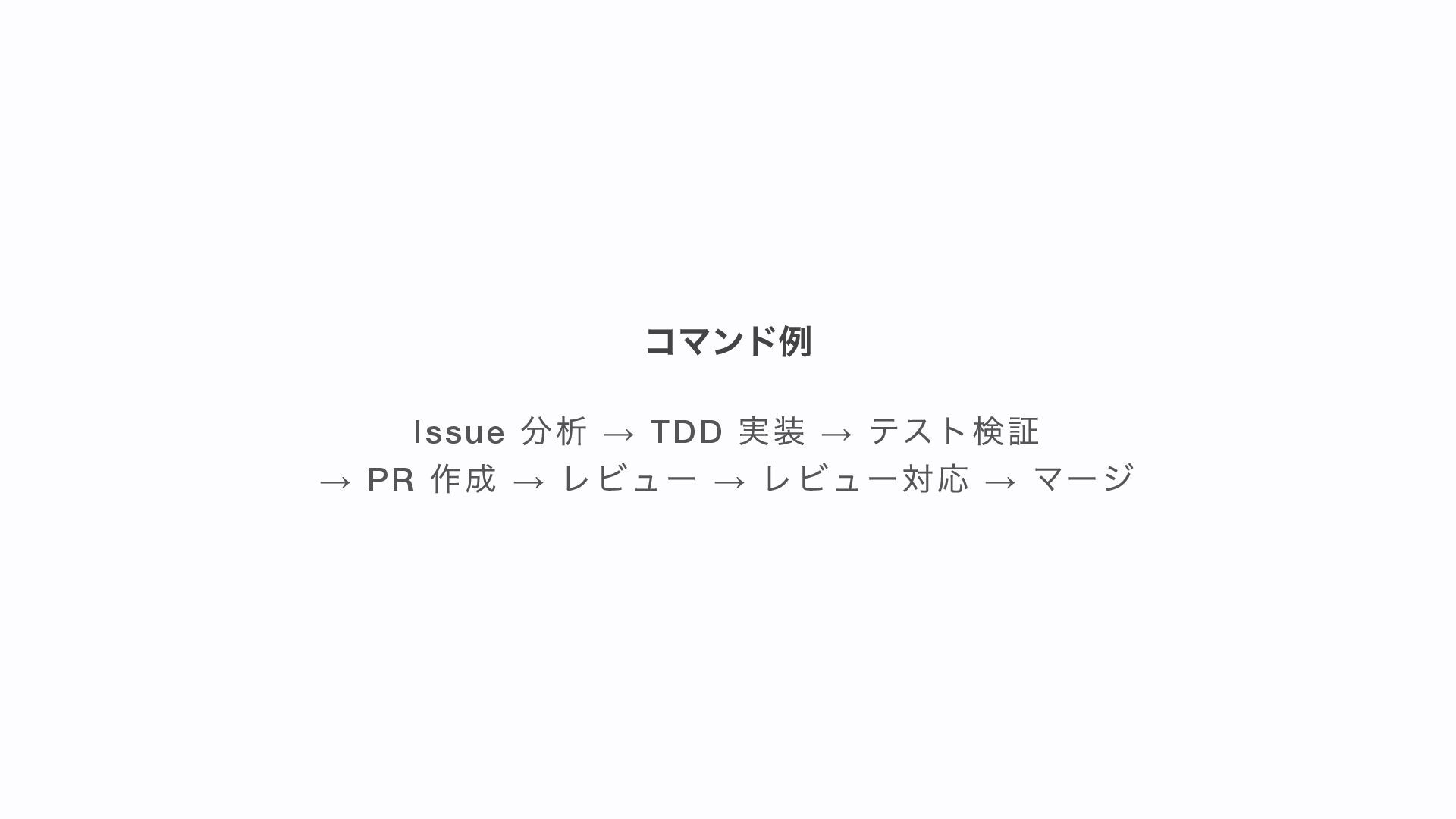 コマンド例 Issue 分析 → TDD 実装 → テスト検証 → PR