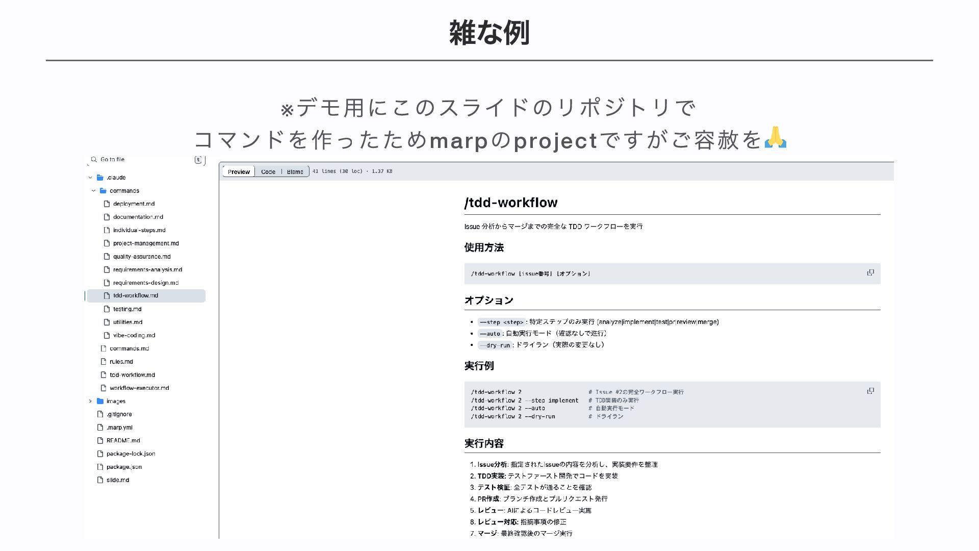 雑な例 ※ デモ用にこのスライドのリポジトリで コマンドを作ったためmarp のproject ですがご容赦を