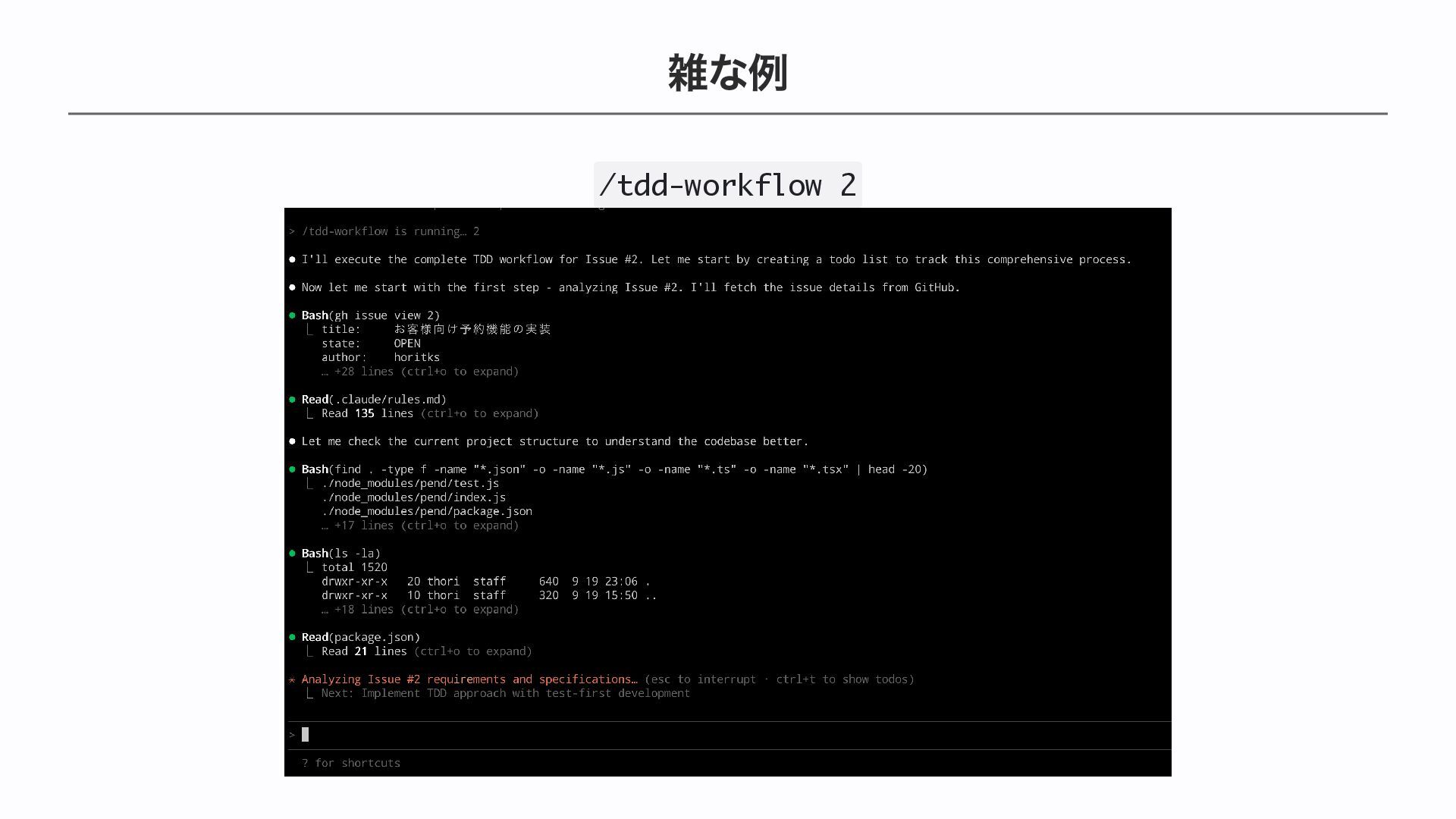Issue 分析と TDD 実装を個別実行することが多い 最初に AI と壁打ちでかっちり設計 → 自律実行 → レビューフェーズで再介入