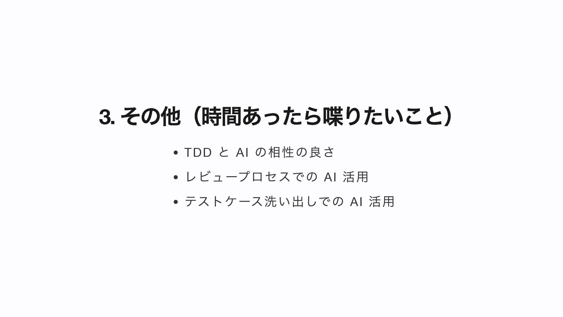 3. その他(時間あったら喋りたいこと) TDD と AI の相性の良さ レビュープロセスでの AI 活用 テストケース洗い出しでの