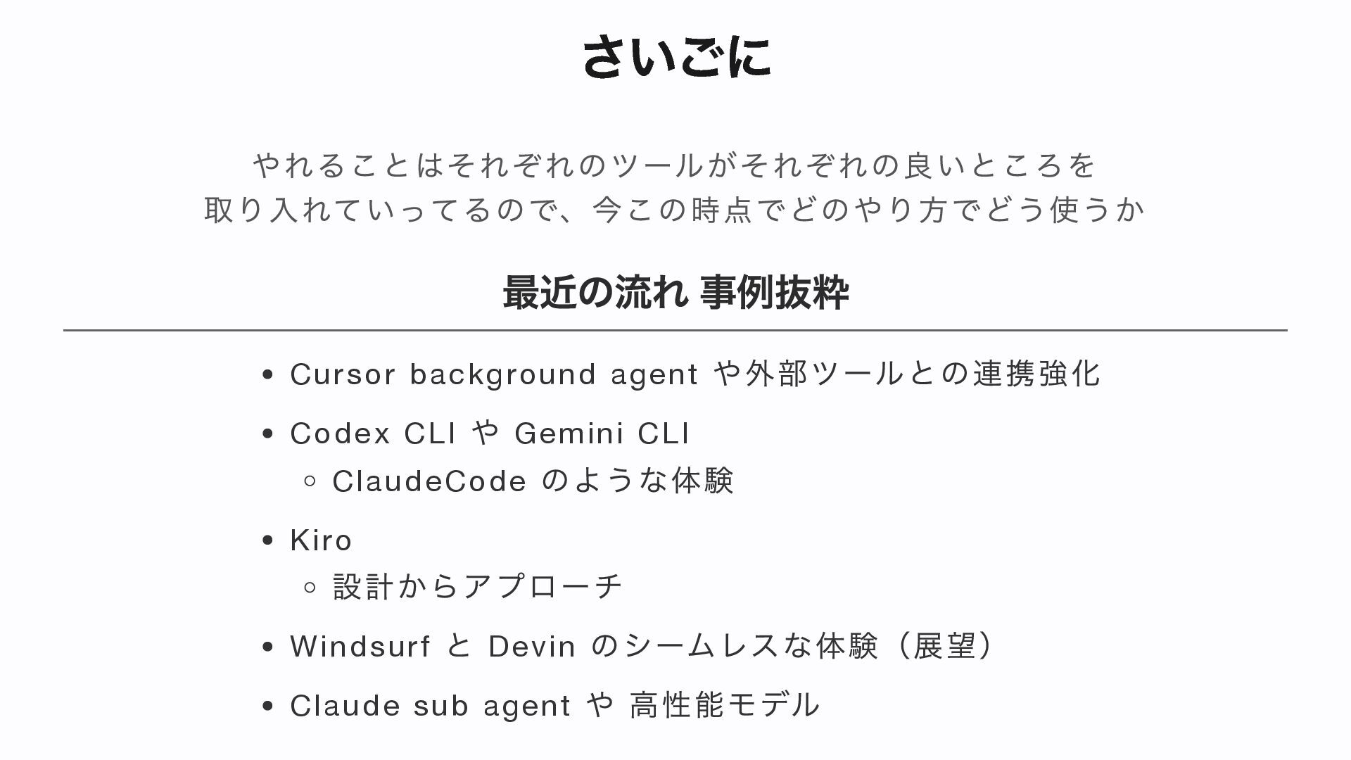 さいごに やれることはそれぞれのツールがそれぞれの良いところを 取り入れていってるので、今この時点でどのやり方でどう使うか 最近の流れ 事例抜粋 Cursor background agent や外部ツールとの連携強化 Codex