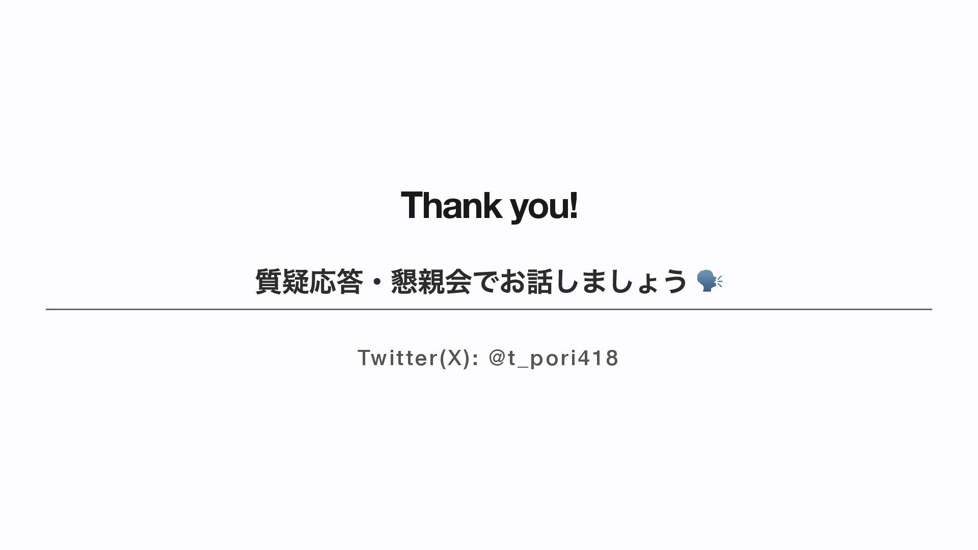 Thank you! 質疑応答・懇親会でお話しましょう 🗣️ Twitter(X): @t_pori418