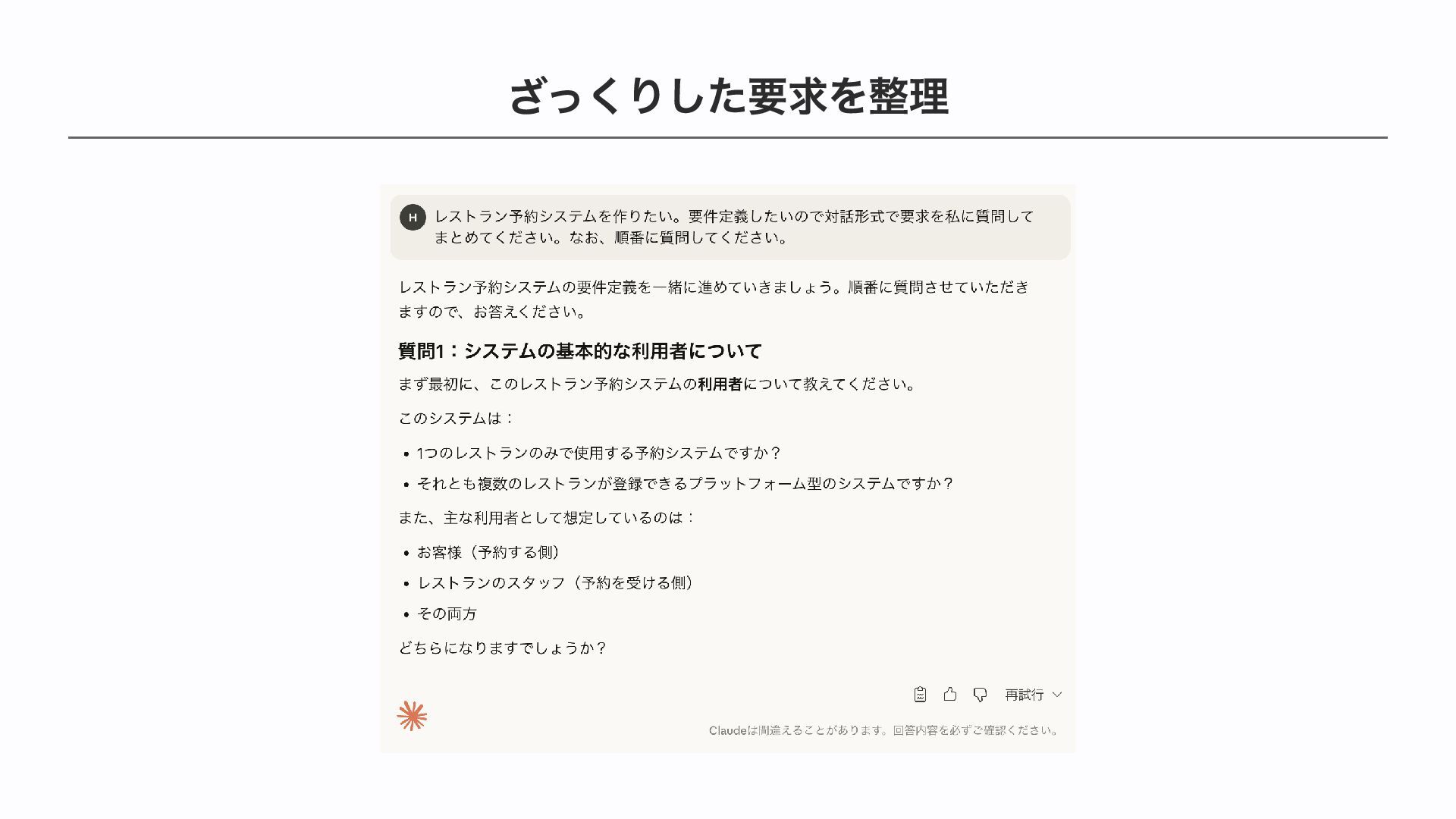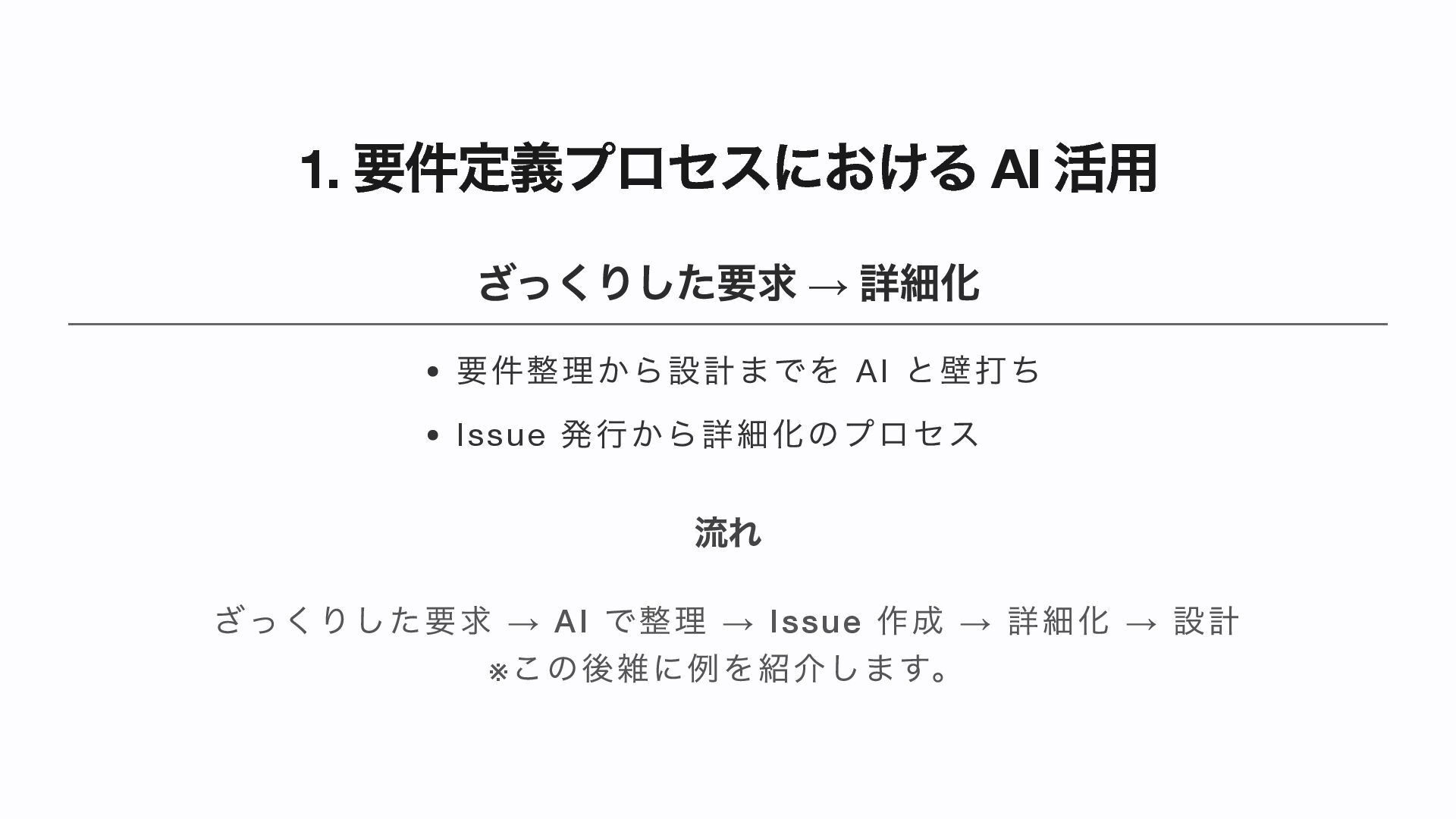 1. 要件定義プロセスにおける AI 活用 ざっくりした要求 → 詳細化 要件整理から設計までを AI と壁打ち