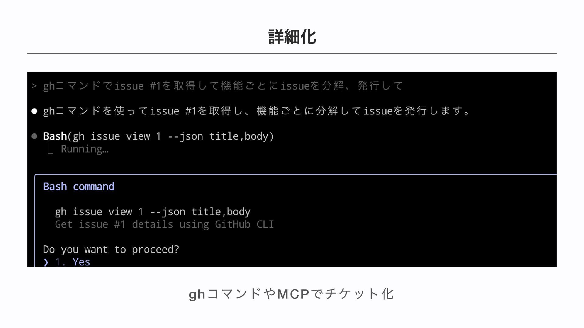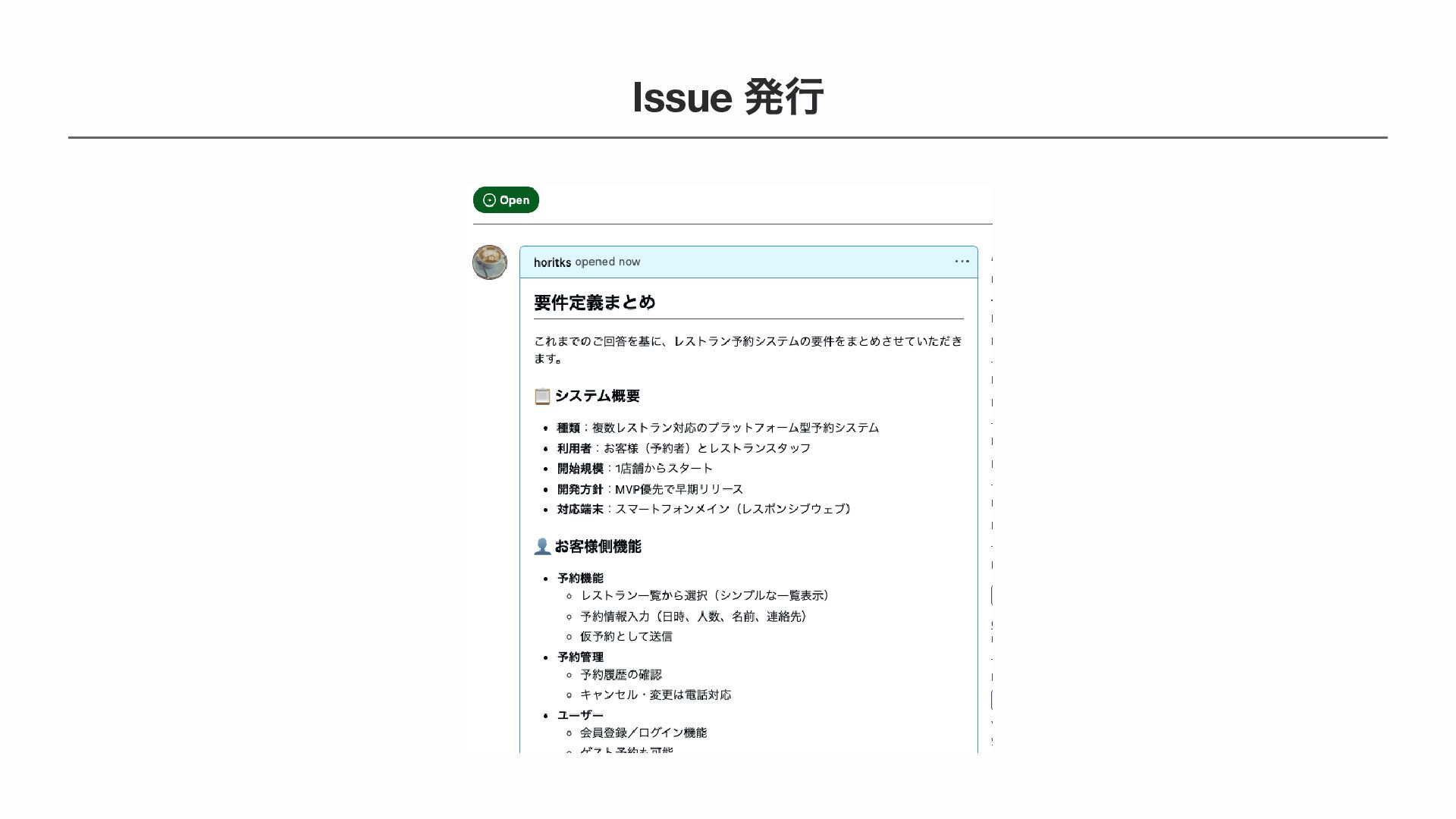 Issue 発行から詳細化のプロセス 流れ ざっくりした要求 → AI で整理 → Issue 作成 → 詳細化 → 設計 ※ この後雑に例を紹介します。