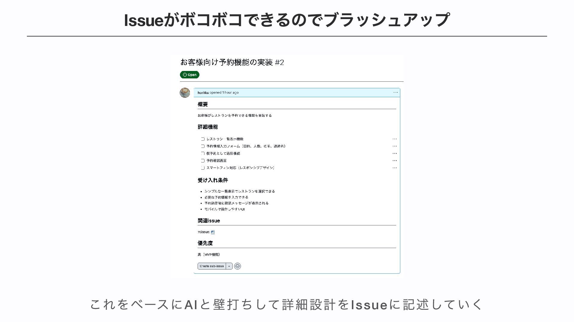 Issue がボコボコできるのでブラッシュアップ これをベースにAI と壁打ちして詳細設計をIssue に記述していく